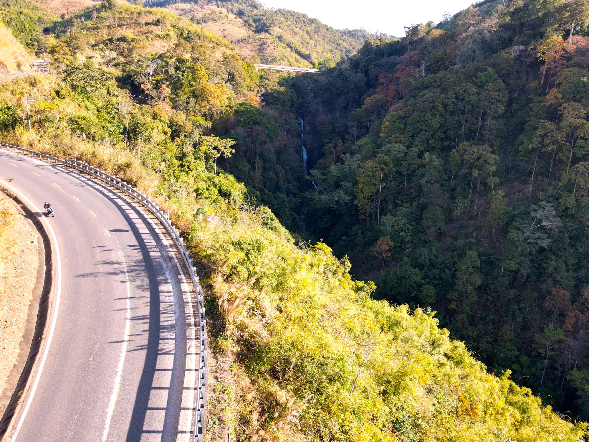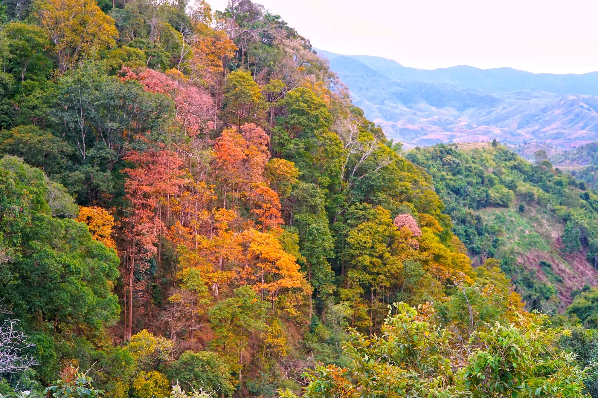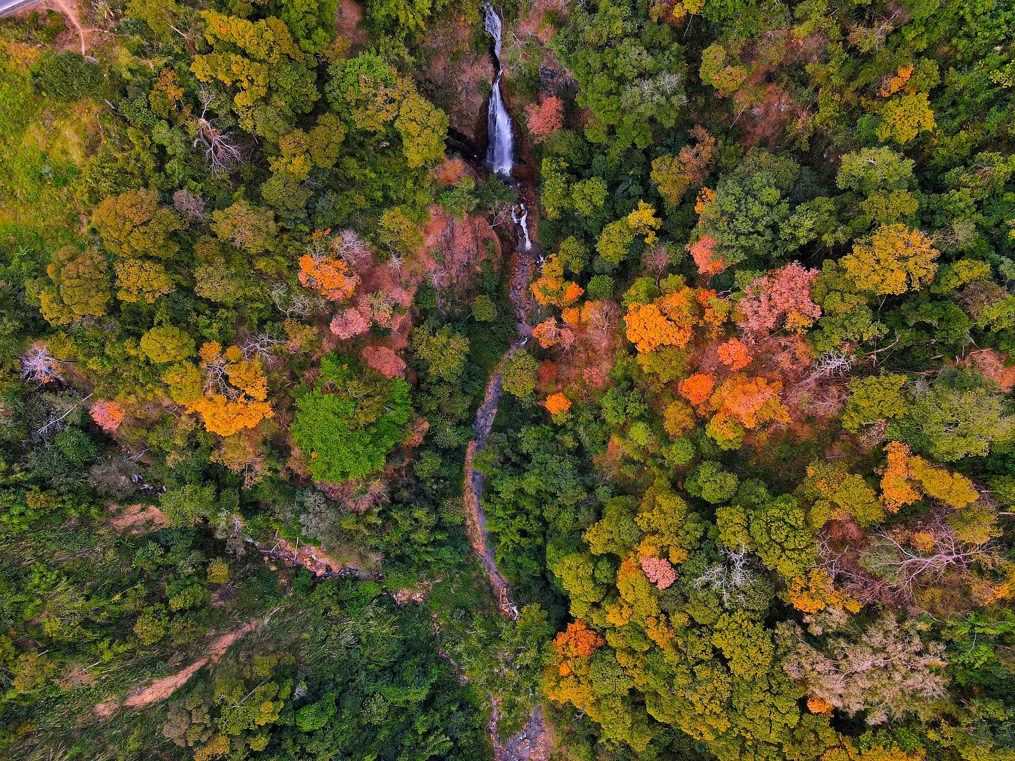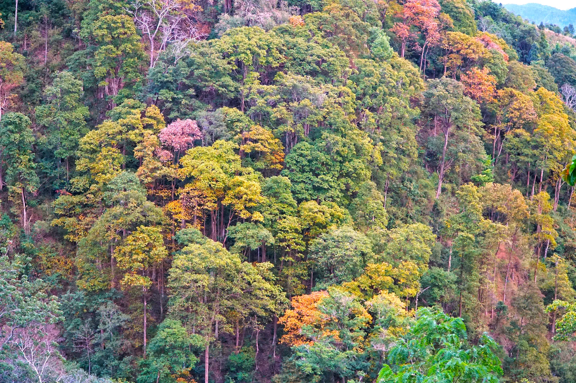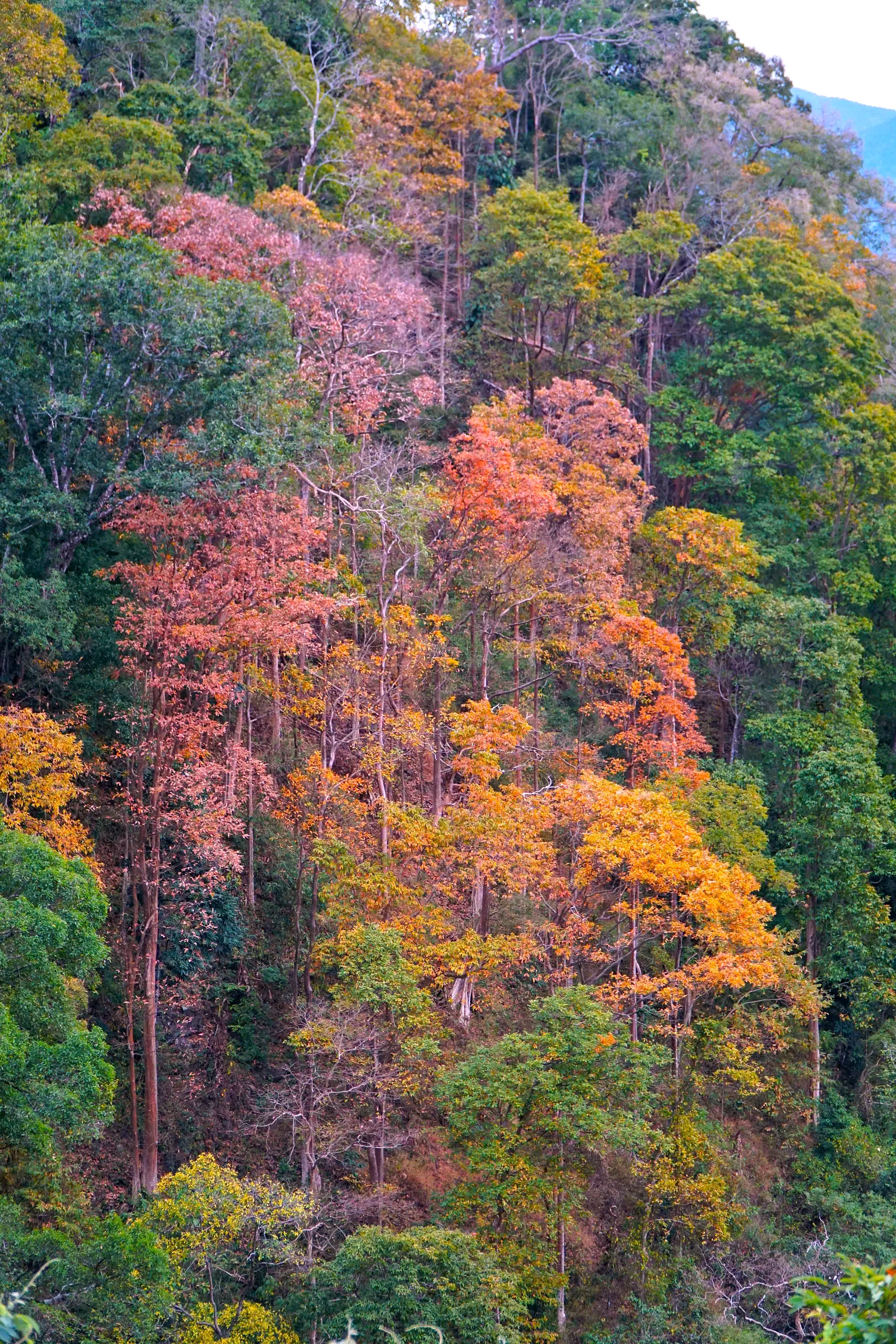 Thời điểm này, rừng tự nhiên dọc theo đèo bước vào giai đoạn chuyển mùa rõ nét. Nhiều cây gỗ đồng loạt thay lá, tạo nên những mảng màu đan xen giữa vàng, đỏ, cam và xanh, khiến cả khu rừng như khoác lên diện mạo mới. Nhìn từ xa, cảnh rừng gợi liên tưởng đến một bức tranh thiên nhiên sống động .