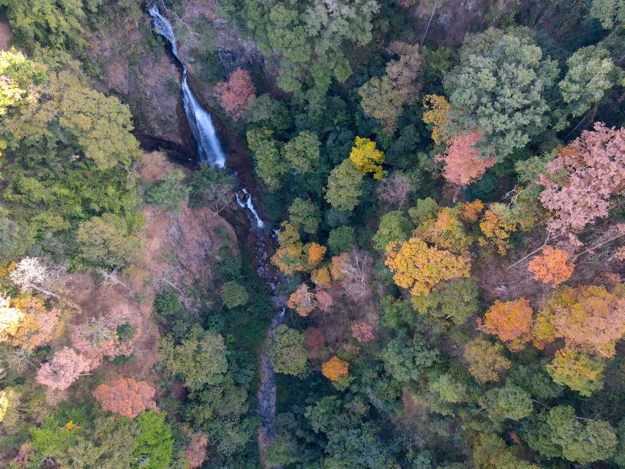 Dòng thác uốn lượn, hoà quyện với những vạt rừng với nhiều cây gỗ