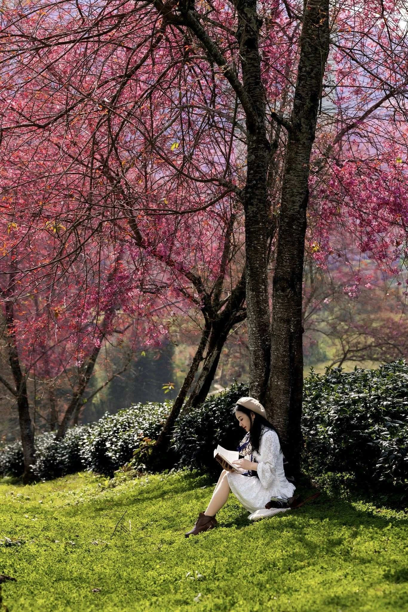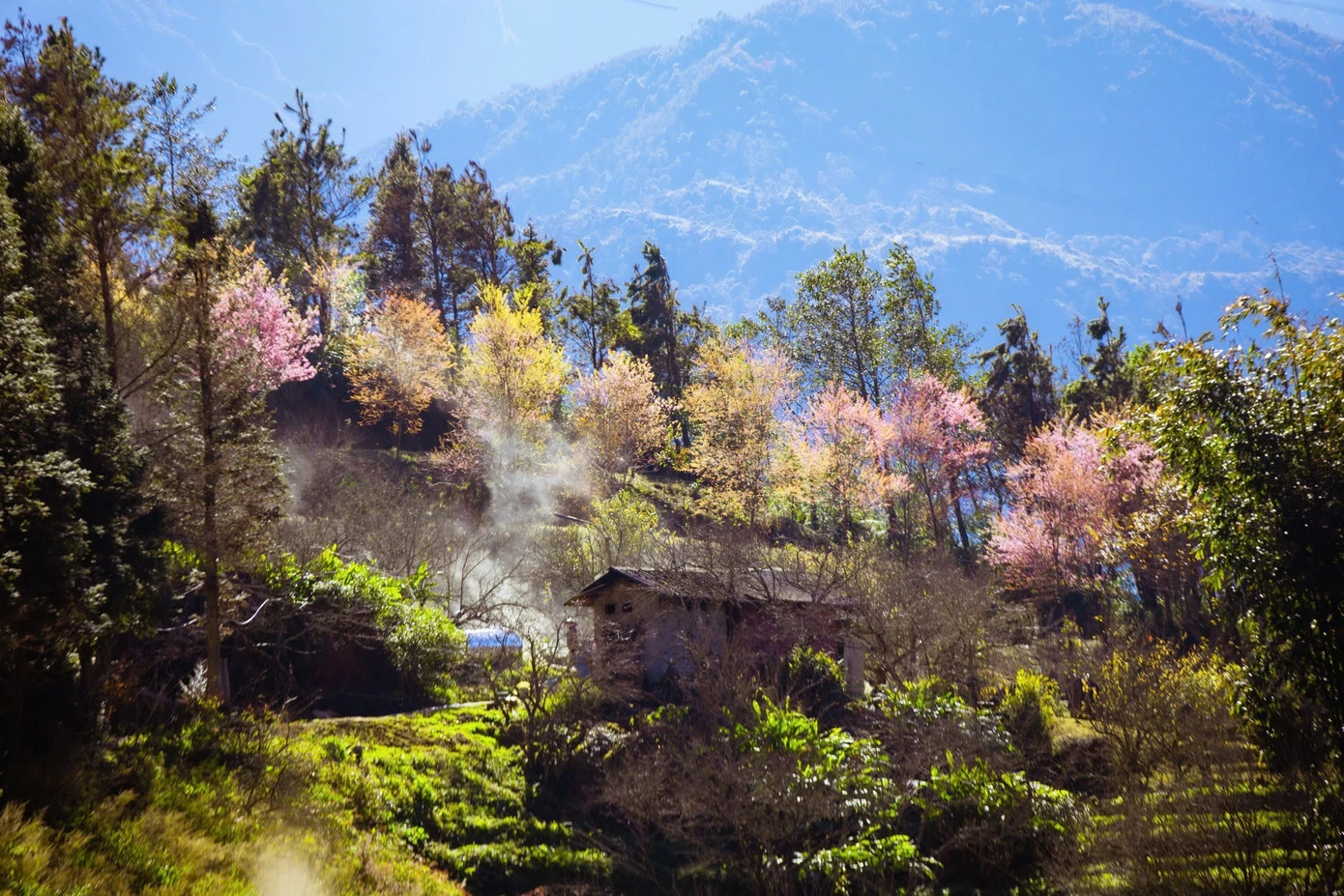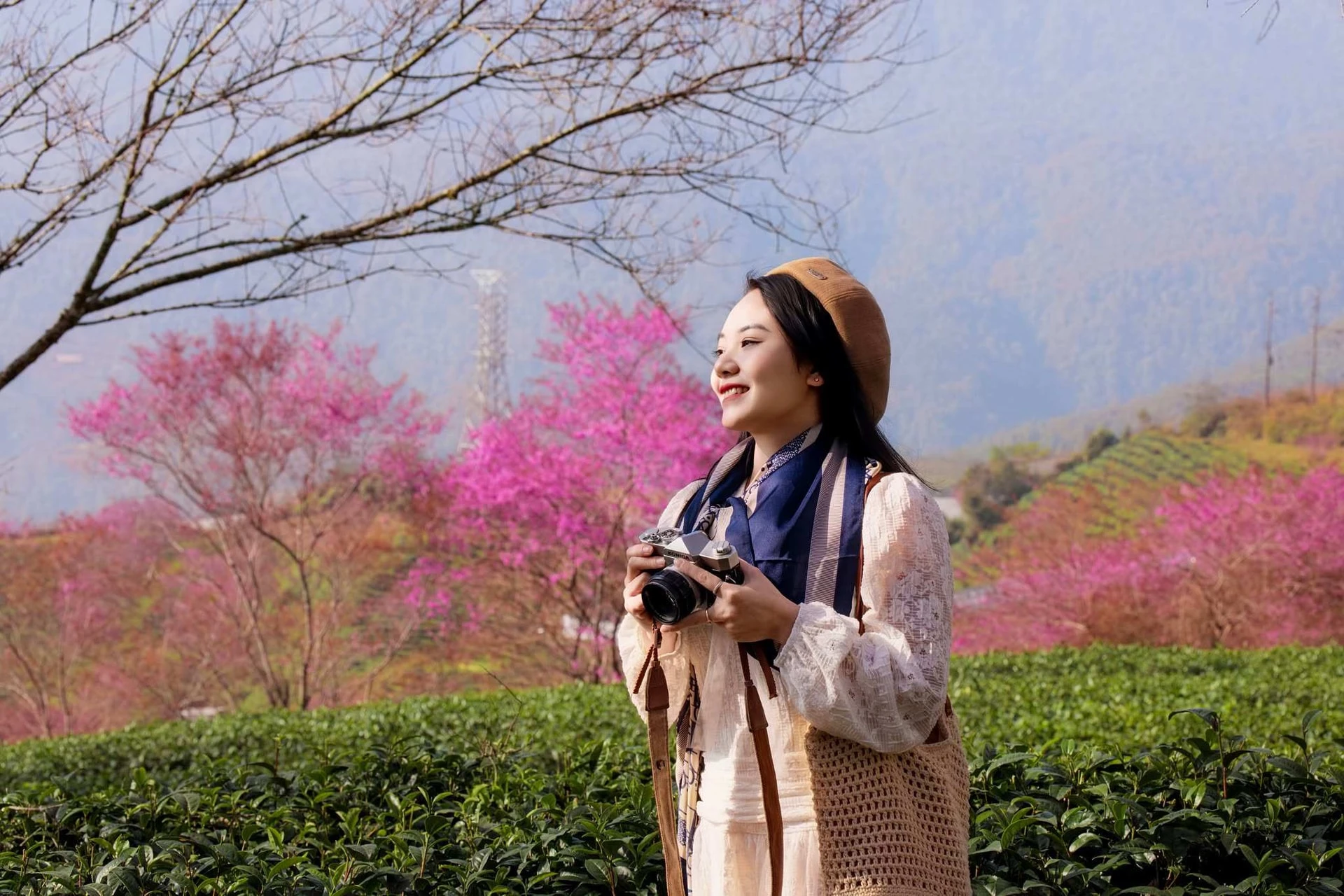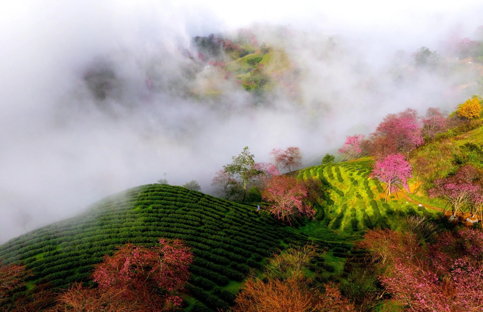 Vẻ đẹp lãng mạn của đồi chè Ô Long vào mùa hoa mai anh đào.