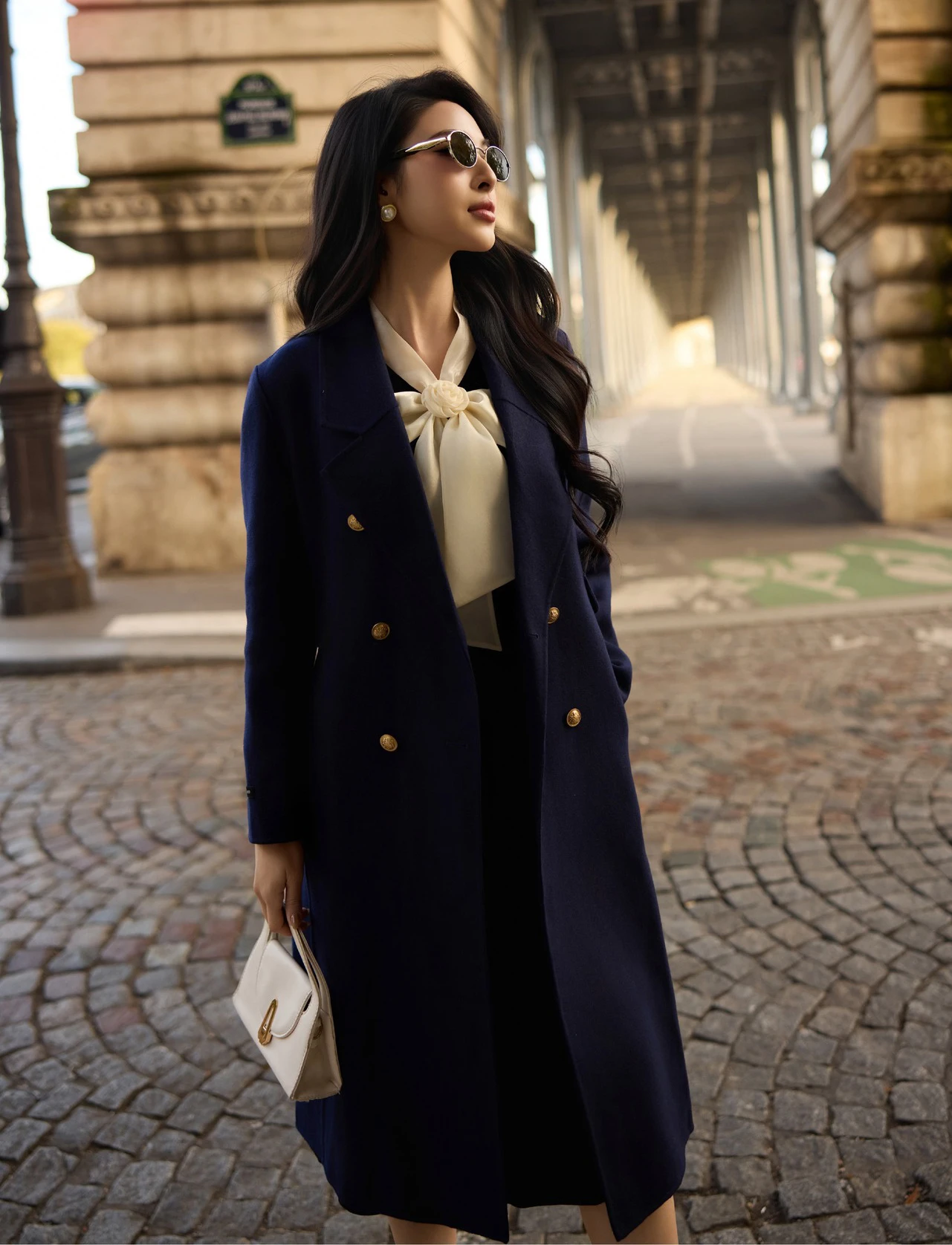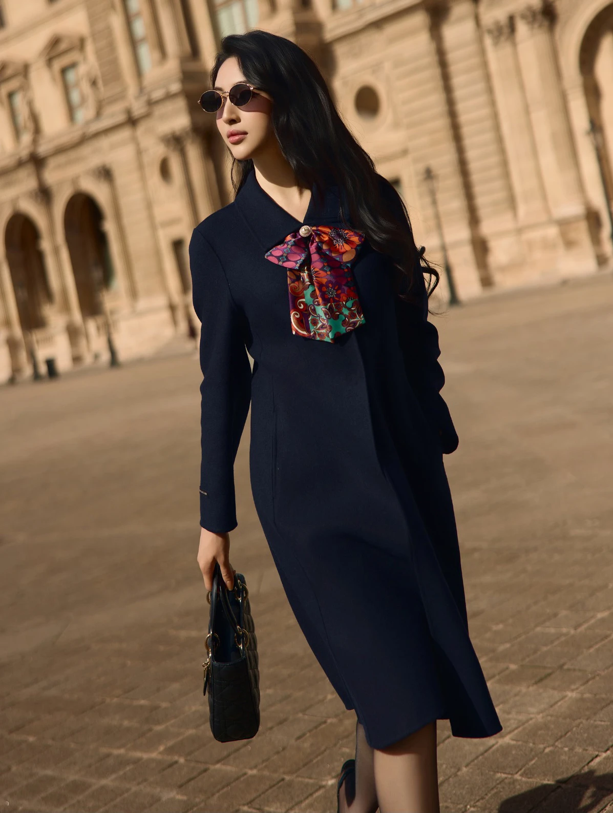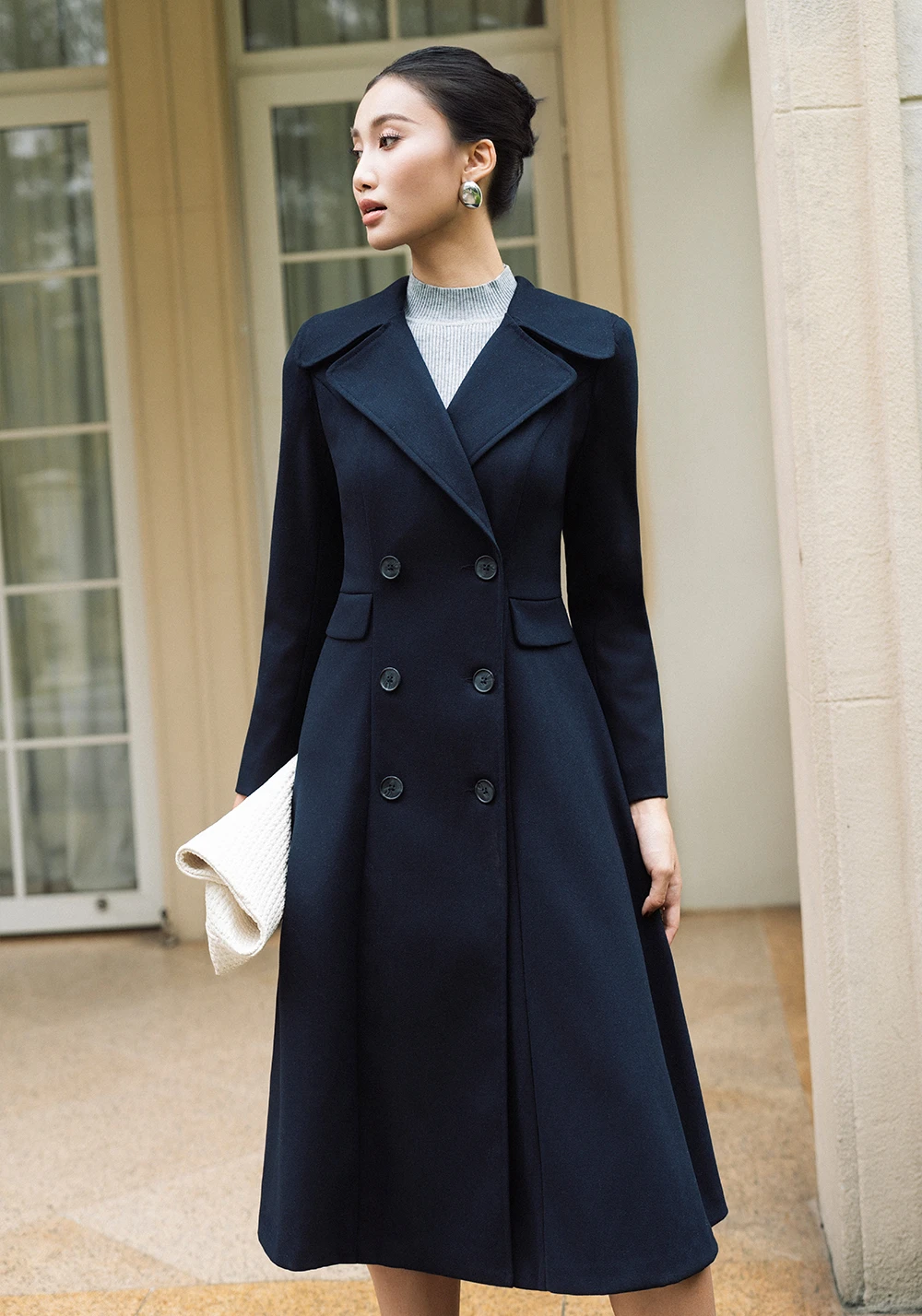 Áo khoác dạ màu xanh đen với hai phong cách khác biệt – thiết kế hai hàng cúc mang dấu ấn về sự thanh lịch cổ điển; thiết kế phối khăn lụa họa tiết nhiều màu sắc tôn nét trẻ trung và hiện đại của quý cô
