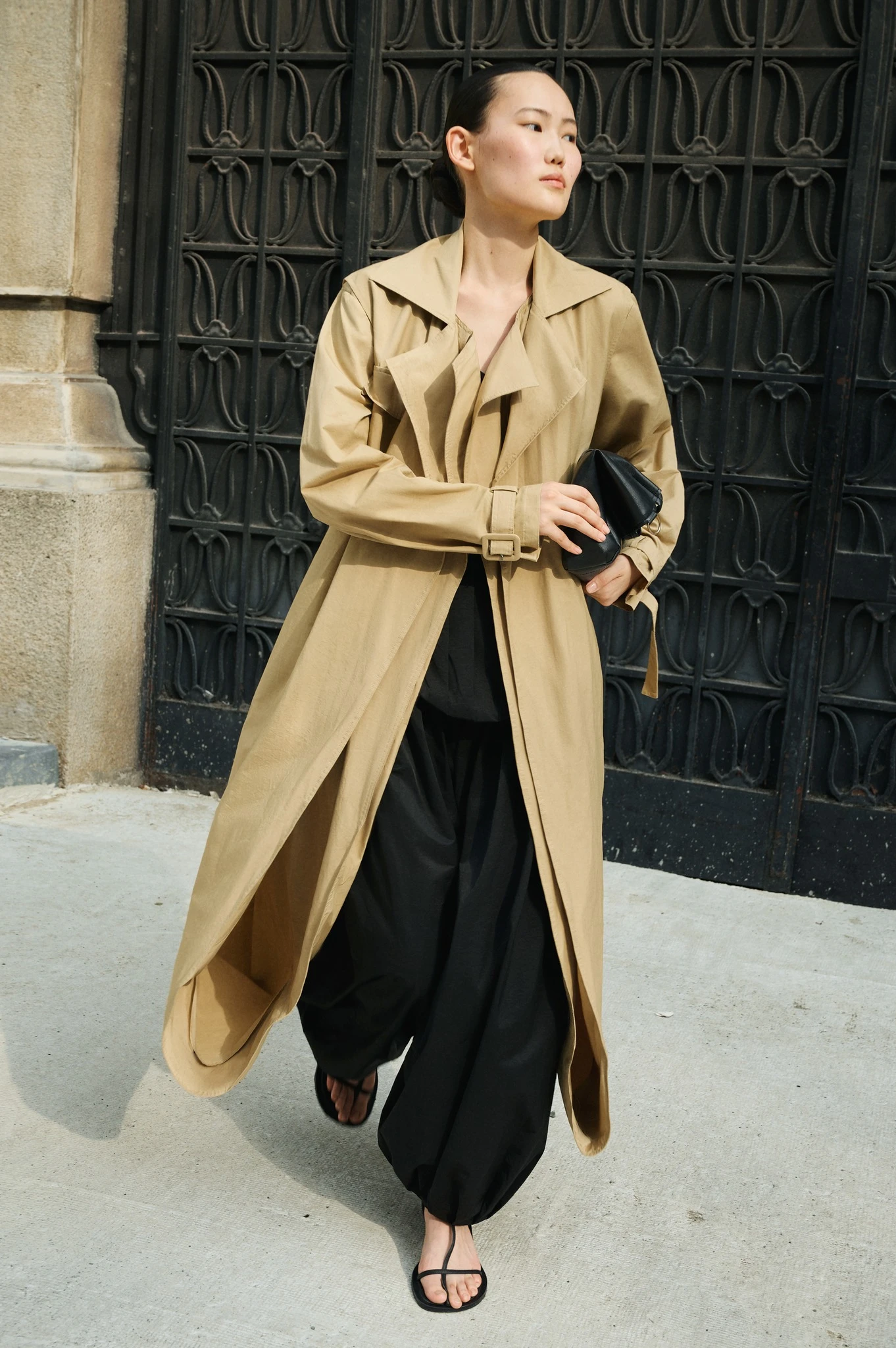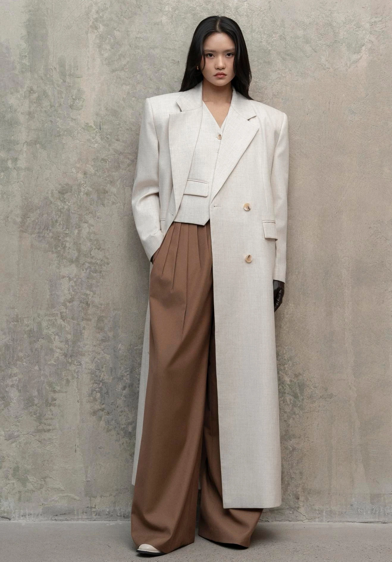 Thổi làn gió mới phóng khoáng vào thiết kế áo khoác dài gấp nếp mang đến sự khác biệt mang đậm dấu ấn sáng tạo. Áo khoác màu beige và trang phục đen tương phản nhẹ nhàng đậm chất street style