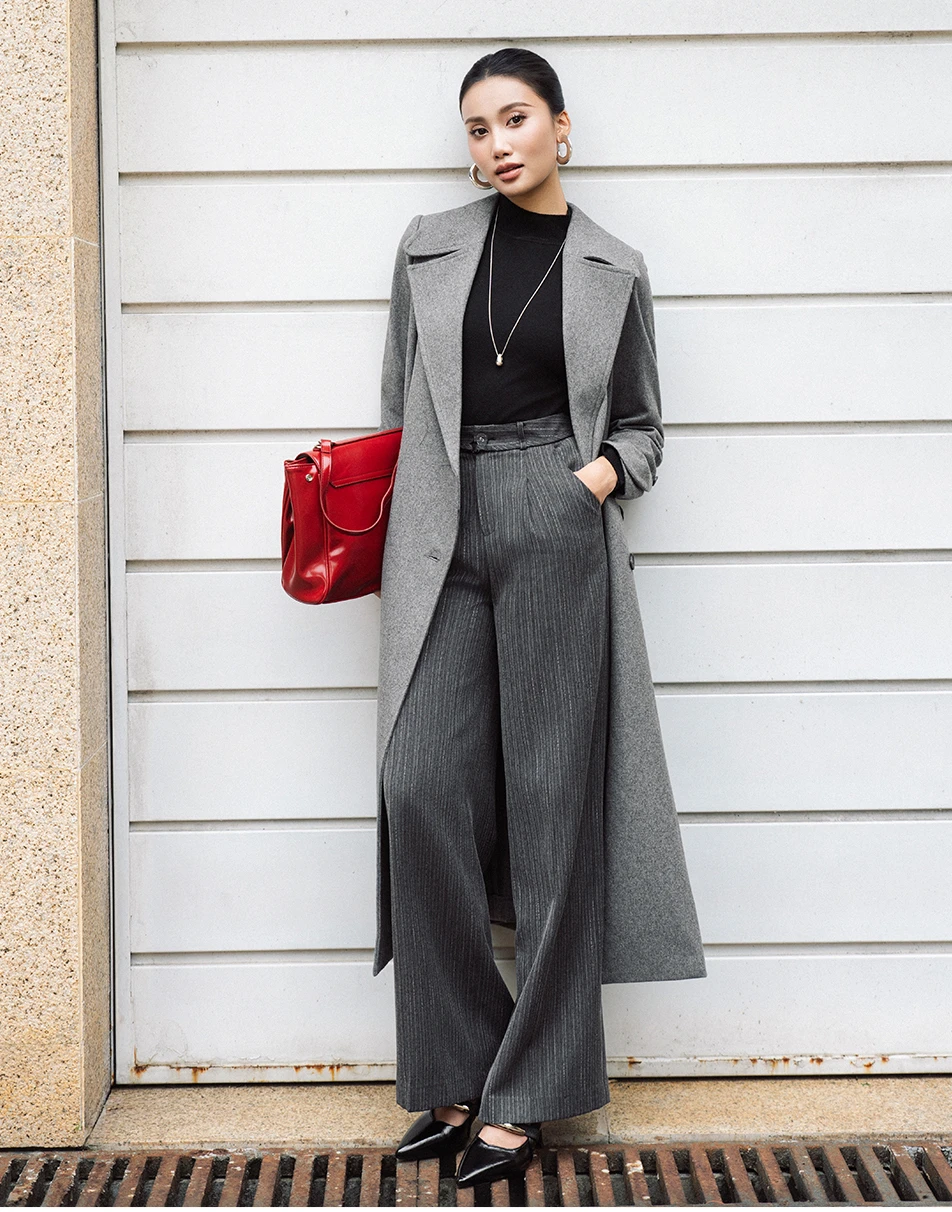 Sự cộng hưởng của phom dáng làm nên khả năng hack chiều cao của trang phục. Áo măng tô dài chạm bắp chân phối quần công sở cạp cao giúp "kéo dài" vóc dáng. Bản phối được tạo điểm nhấn bằng vòng cổ dây mảnh thả dài và túi xách màu đỏ nổi bật