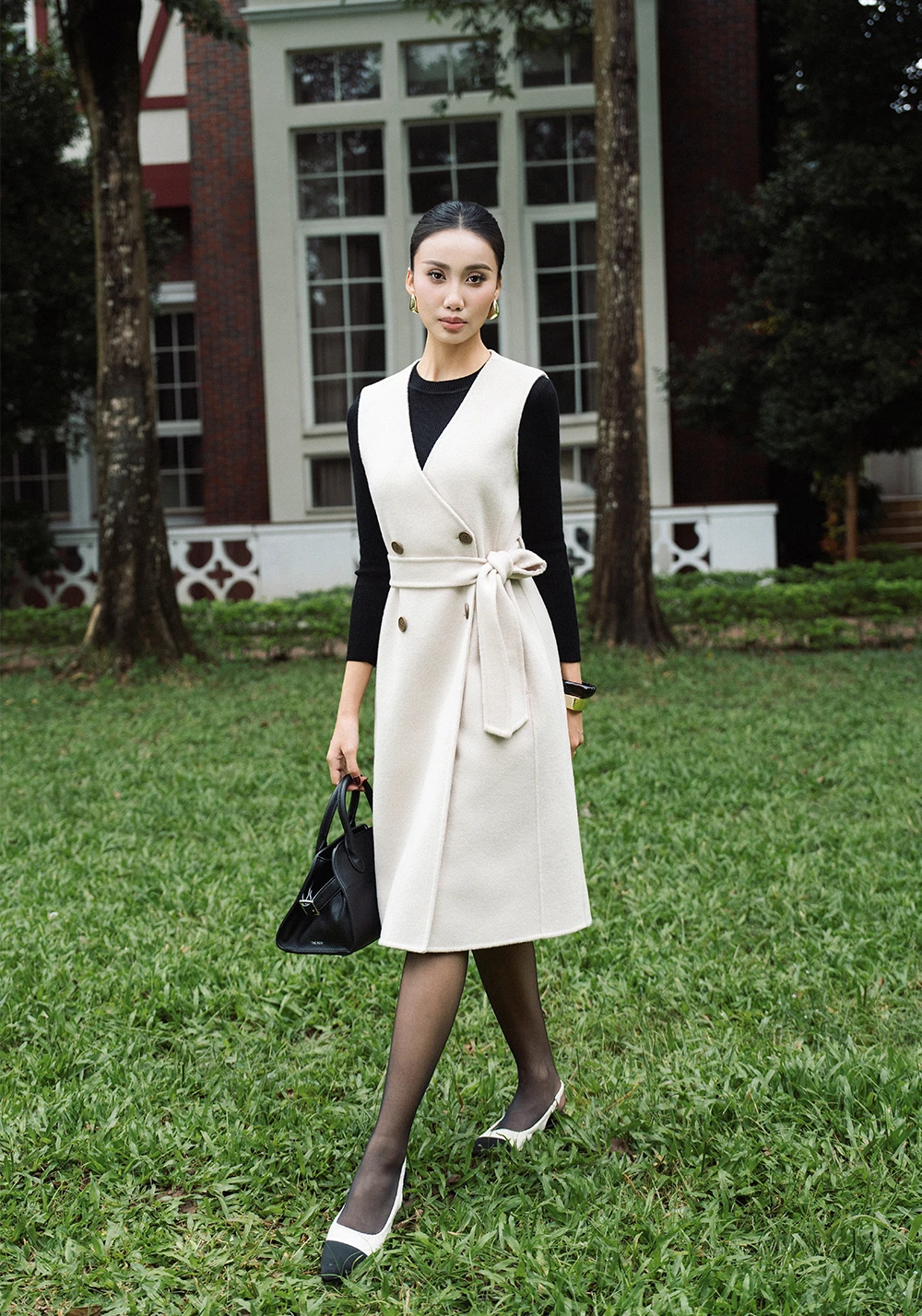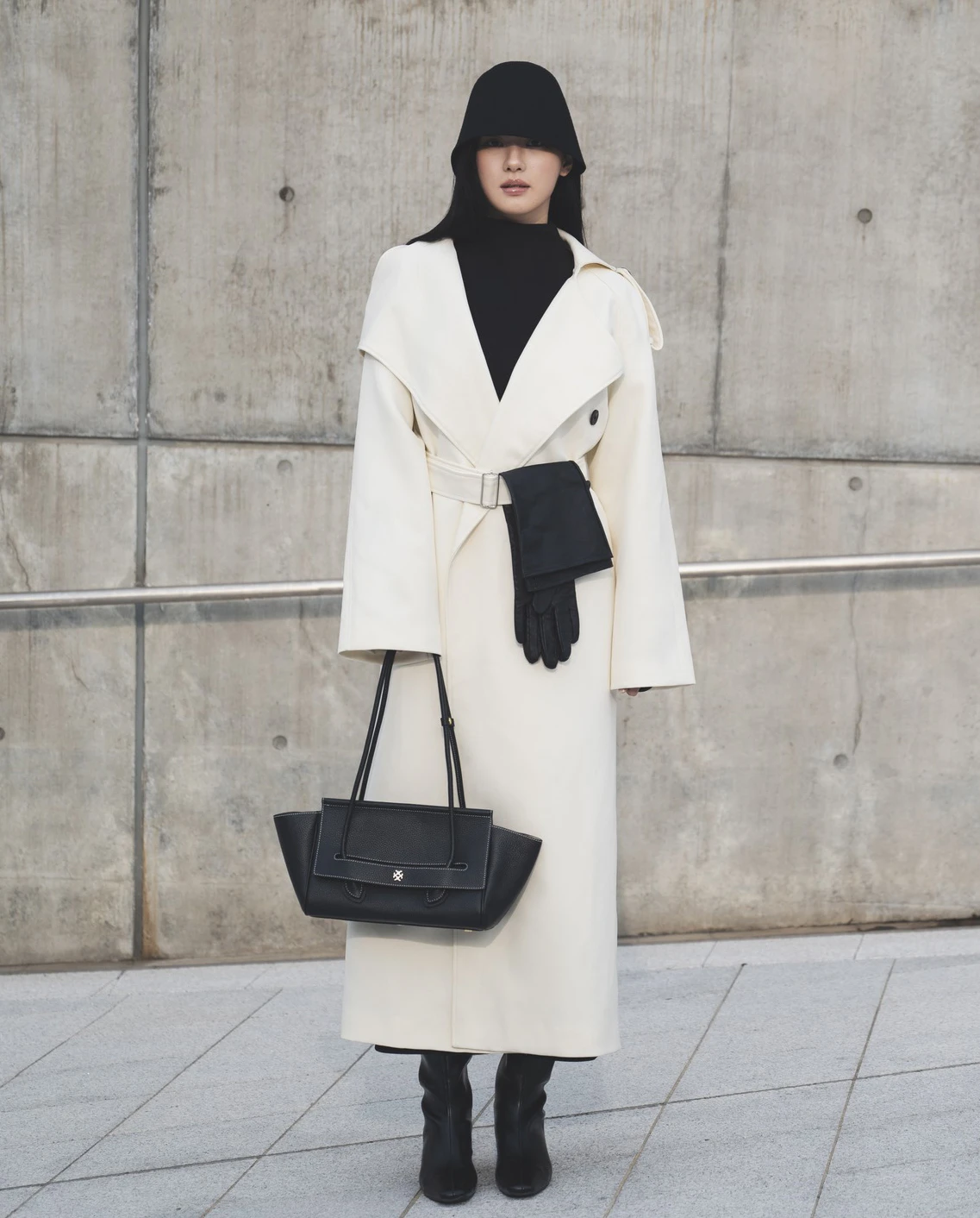 Hóa quý cô sang chảnh kiêu kỳ khi chọn sắc trắng kem và dáng áo khoác dài chạm bắp chân. Bản phối “tuyệt đối điện ảnh” này sử dụng hai tông màu sáng tối để tạo nên sự thu hút và tính thẩm mỹ