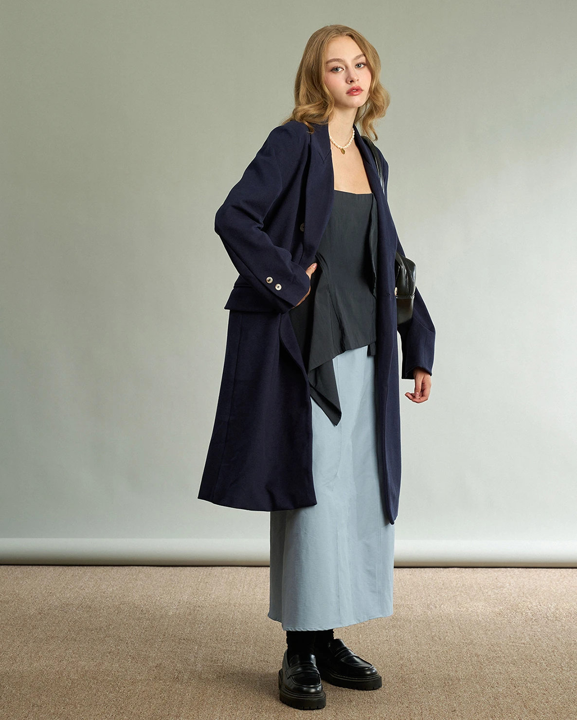 Xanh đen, xanh denim và sắc đen hòa lẫn trong một tổng thể phá cách tinh nghịch. Áo khoác dài tông xanh đen có thể là lựa chọn cho cả phong cách công sở lẫn dạo phố