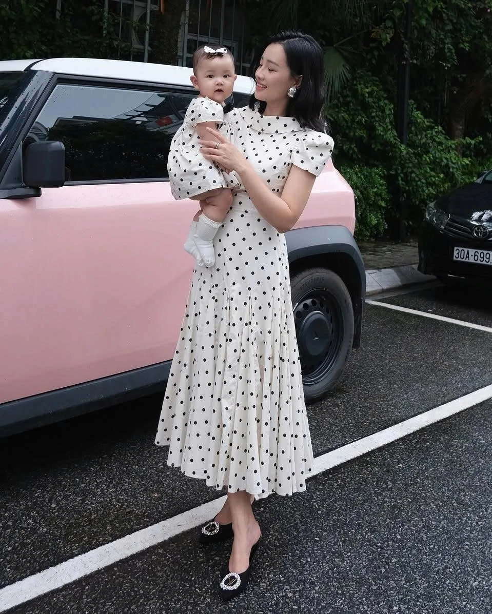 MC Quỳnh Chi diện đồ đôi cùng con gái xuống phố. Từ khi sinh con, cô có thêm cảm hứng để phát triển thêm dòng sản phẩm thời trang dành cho trẻ em.