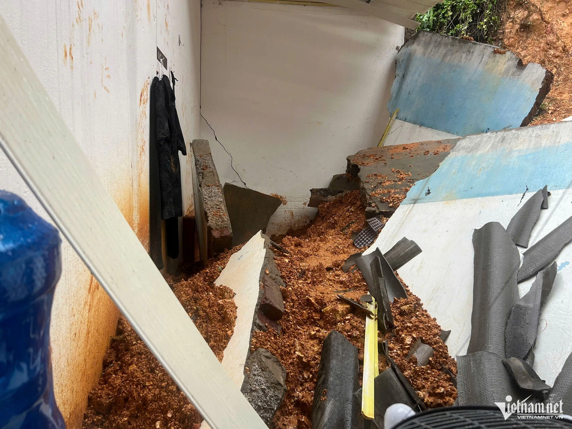 Ghi nhận tại hiện trường cho thấy, khu trọ nằm sát chân đồi, nơi có địa hình dễ bị sạt lở khi mưa lớn. Bức tường phía hông phòng trọ bị đổ sập hoàn toàn, bùn đất tràn vào bên trong vùi lấp gần như toàn bộ gian phòng. Đồ đạc bị cuốn trôi, nhiều vật dụng cá nhân hư hỏng nặng, cảnh tượng hoang tàn.