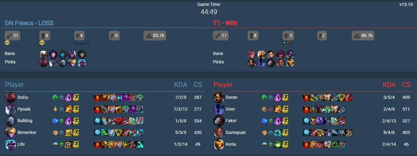 Dù đã giành chiến thắng 2-0 trước đội tuyển đang đứng cuối BXH là DN Freecs, nhưng rõ ràng trong trận đấu đó, ai cũng có thể thấy rõ T1 từng có 2/3 thời gian của ván 2 gặp rất nhiều khó khăn. Họ không thể khoan thủng dàn chắn rất cứng cáp của đối thủ và nếu không nhờ những khoảnh khắc siêu sao của cặp Gumayusi - Keria, không ai biết kết quả sẽ đi về đâu. Bản thân Oner sau trận đấu cũng thừa nhận là cả đội đã bị bắt bài ngay từ khâu cấm chọn.