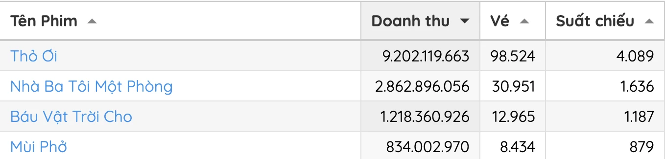 Tính đến 14h ngày 18/2 (mùng 2 Tết), Thỏ Ơi! đã vượt mốc 60 tỷ đồng, chính thức bứt tốc và nắm giữ vị trí dẫn đầu trên bảng xếp hạng phòng vé mùa Tết năm nay. Đáng chú ý, tổng doanh thu của ba bộ phim còn lại cộng lại cũng chỉ xấp xỉ con số này, cho thấy mức độ áp đảo rõ rệt của tác phẩm trong cuộc đua đầu năm.Hiệu ứng khán giả kéo đến rạp đông đảo giúp Thỏ Ơi! tiếp tục được ưu tiên về suất chiếu tại nhiều cụm rạp trên toàn quốc. Lợi thế thương mại cùng sức lan tỏa mạnh mẽ trên mạng xã hội đang tạo ra khoảng cách ngày càng nới rộng giữa bộ phim và các đối thủ còn lại.
