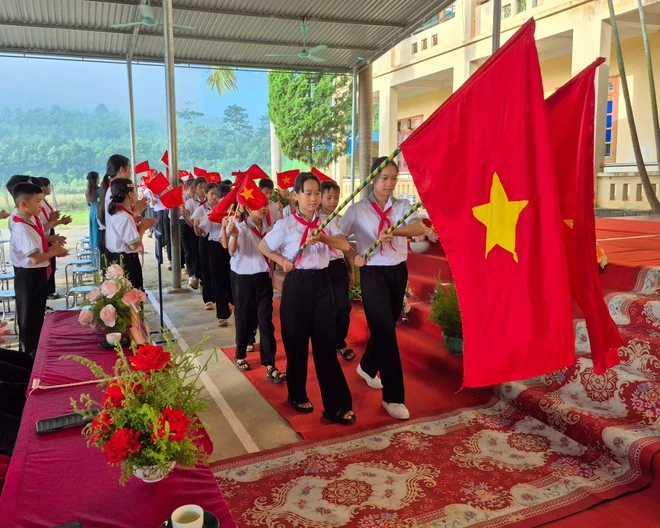 Con đường đất dẫn lên Trường THCS Trung Sơn (xã Trung Sơn, tỉnh Tuyên Quang) quanh co theo triền đồi, sương sớm bảng lảng giăng kín lối. Tiếng bước chân học trò xen lẫn tiếng cười rộn rã làm không gian bừng sáng hơn. Trên sân trường nhỏ nằm nép mình giữa những đồi cây, cờ hoa rực rỡ đã được thầy trò chuẩn bị từ sớm.