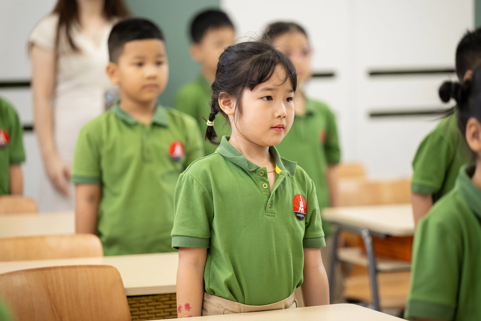 Đơn cử như tại trường Marie Curie Hà Nội cơ sở Mỹ Đình, thay vì tập trung toàn trường, học sinh được phân về từng lớp để theo dõi trực tuyến. Dù quy mô gói gọn, nhưng các nghi lễ chào cờ, văn nghệ hay xem truyền hình trực tiếp vẫn diễn ra nghiêm túc. Điều thú vị là chính trong không gian nhỏ ấy lại xuất hiện vô số khoảnh khắc “bất ngờ”: có em tiểu học vừa nghiêm trang vừa… ngáp ngủ, có gương mặt vẫn còn mếu máo, bỡ ngỡ với trường mới, lớp mới.