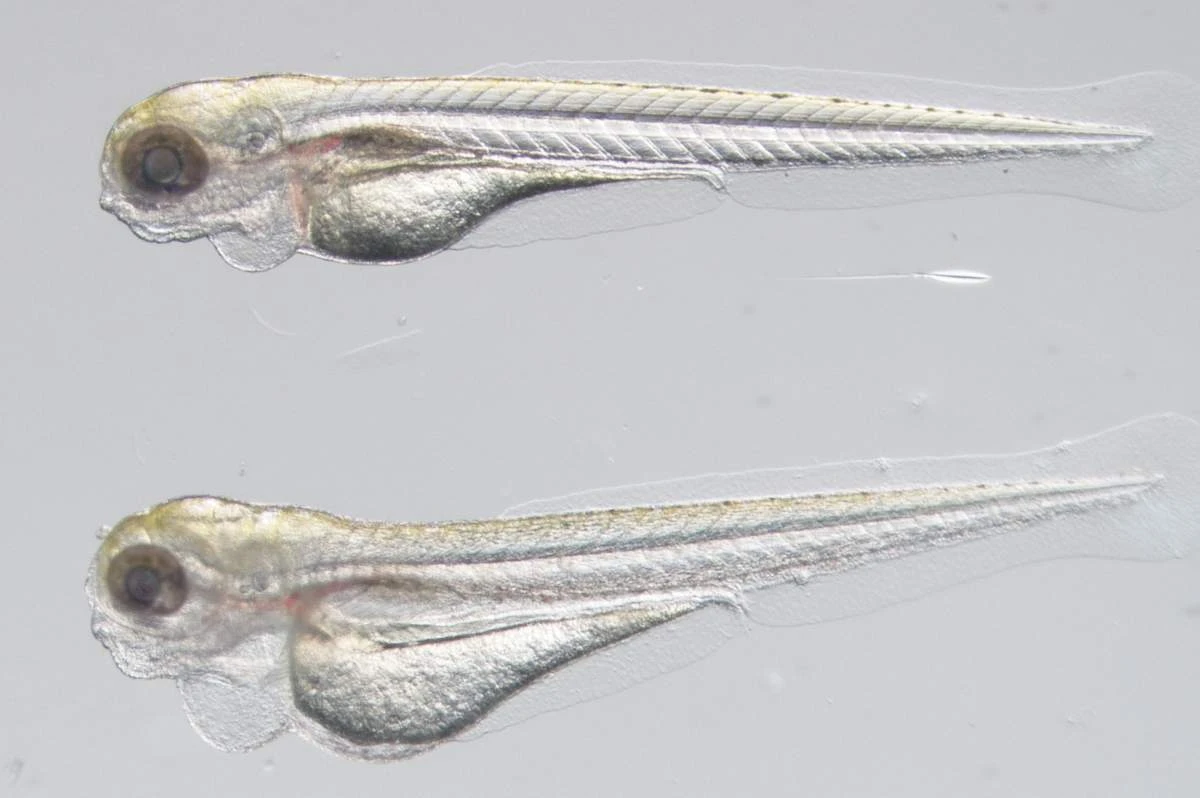 Phôi cá ngựa vằn 5 ngày tuổi dưới kính hiển vi: Phía trên là phôi bình thường, phía dưới là phôi đột biến mang gene NRAS đã biến đổi lấy từ bệnh nhân mắc KLA. Ở phôi đột biến, mạch bạch huyết chính bị phình to bất thường, tái hiện đặc điểm điển hình của bệnh nhân KLA. Ảnh: Viện Weizmann