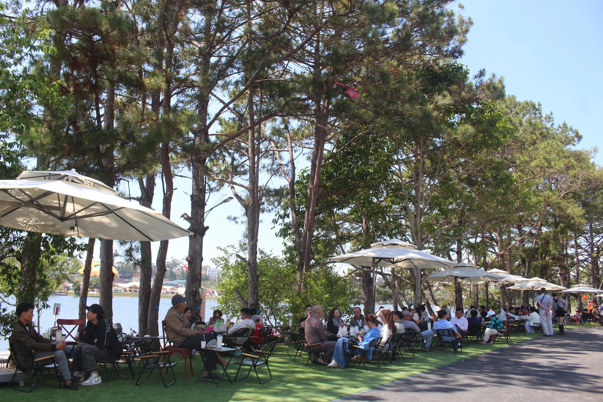 Du khách vừa uống cà phê vừa ngắm hồ Xuân Hương trong không gian xanh mát