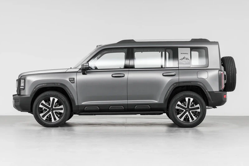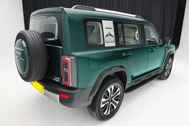 Ở phần thân xe, tay nắm cửa dạng kéo truyền thống kết hợp cùng trụ C thiết kế dày với họa tiết hình núi tạo điểm nhấn mạnh mẽ. Giá nóc được tích hợp sẵn giúp tăng tính linh hoạt khi chở đồ. Phía sau xe mang phong cách đơn giản nhưng cứng cáp, nổi bật với lốp dự phòng treo ngoài, logo GWM đặt phía trên, cụm đèn hậu dạng “mặt trời” độc đáo cùng cản sau phối hai tông màu đen – bạc tạo hiệu ứng thị giác nhiều lớp.