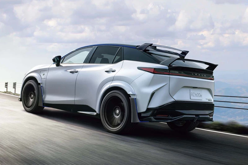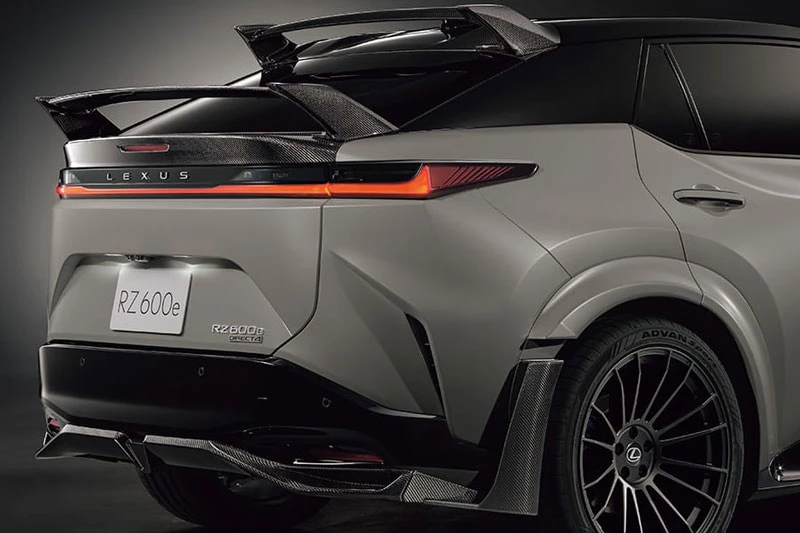 Xe có hai tùy chọn màu sơn Neutrino Gray và Hakugin II, đều phối nền đen tương phản, kết hợp các chi tiết carbon lộ thiên và điểm nhấn màu xanh dương đặc trưng của dòng xe điện Lexus. Bộ mâm hợp kim Enkei 21 inch sơn đen mờ góp phần hoàn thiện dáng vẻ thể thao, đi kèm hệ thống phanh hiệu suất cao với đĩa phanh trước đường kính 20 inch và kẹp phanh nhôm nguyên khối 6 piston. Hệ thống treo cũng được hạ thấp 20 mm so với RZ 550e F Sport, giúp cải thiện độ ổn định và khả năng bám đường khi vận hành ở tốc độ cao.