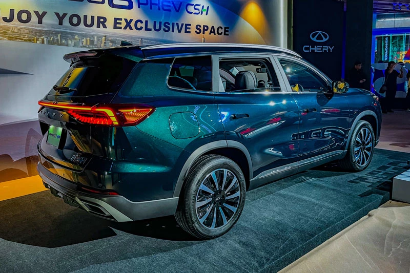 Đuôi xe nổi bật với dải đèn LED kéo dài toàn chiều ngang cùng dòng chữ “CHERY” dập nổi. Kích thước tổng thể đạt 4.749 x 1.880 x 1.710 mm, chiều dài cơ sở 2.825 mm, gần tương đương Honda CR-V nhưng mang dáng vẻ gọn gàng, mạnh mẽ hơn.