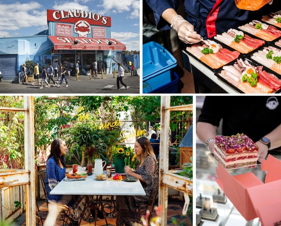 Sydney là thiên đường cho những người yêu ẩm thực. Thành phố tự hào với văn hóa cà phê phát triển, nơi mỗi quán lại có một phong cách riêng. The Grounds of Alexandria nổi bật với không gian sân vườn xanh mướt, trong khi Black Star Pastry nổi tiếng với món bánh dâu tây dưa hấu độc đáo. Để thưởng thức hải sản tươi sống, không nơi nào bằng Chợ cá Sydney (Sydney Fish Market) – chợ hải sản lớn nhất Nam bán cầu. Du khách có thể chọn mua tôm, cua, cá, hàu và thưởng thức ngay tại bến cảng nhộn nhịp.