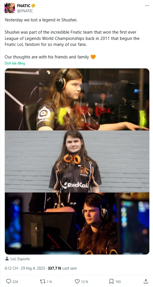 Thông báo của FNC: Ngày hôm qua chúng ta đã vĩnh biệt huyền thoại Shushei. Anh là thành viên của đội hình FNC huyền thoại đã vô địch CKTG 2011 và bắt đầu cho sự hâm mộ FNC trên toàn thế giới. Chúng tôi xin gửi lời chia buồn sâu sắc đến gia đình và bạn bè của anh ấy.