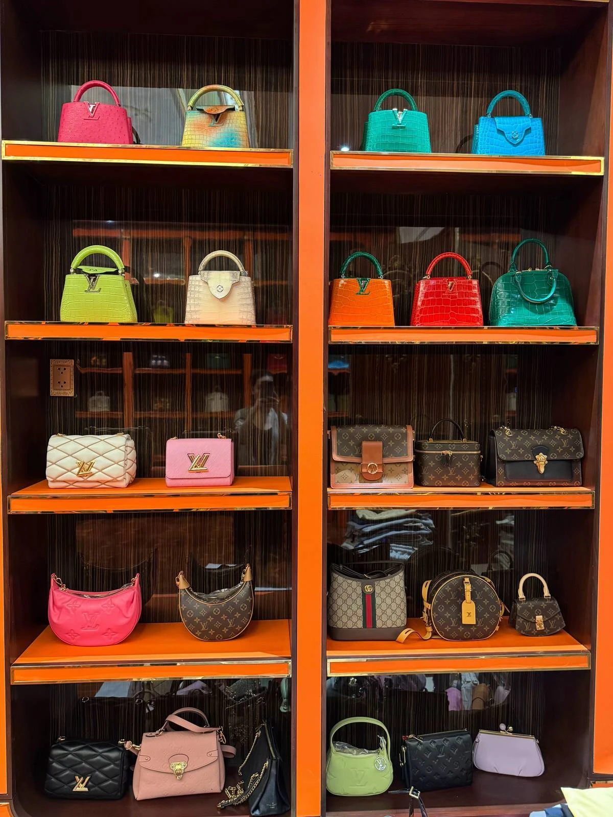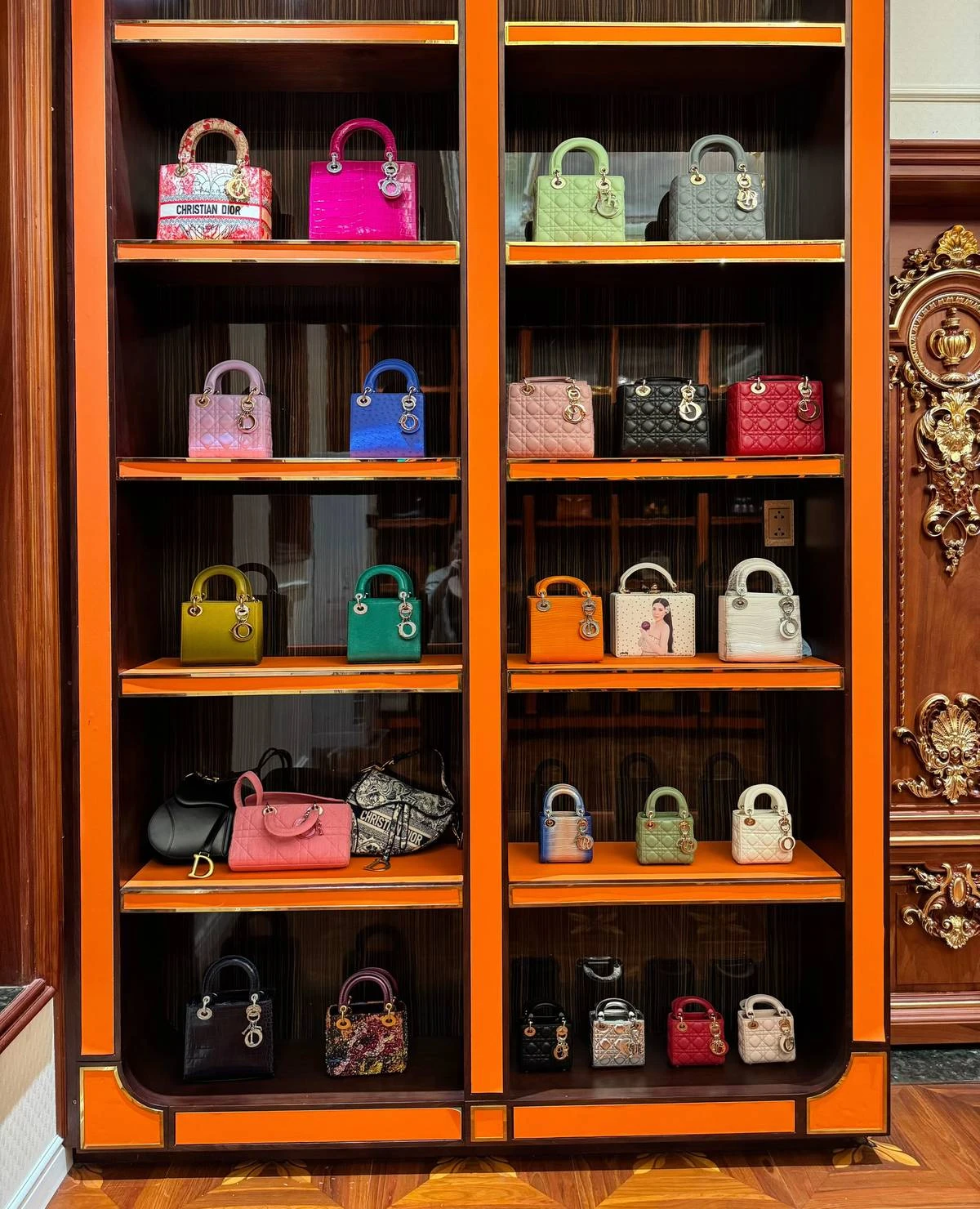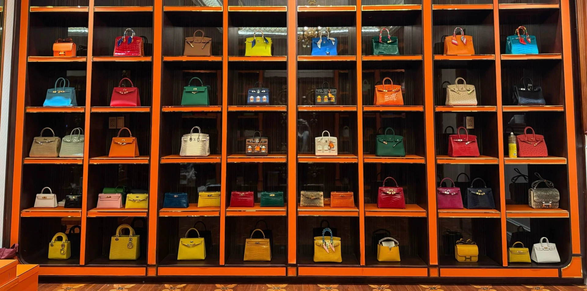 Cận cảnh những chiếc túi được bày biện trong tủ kính trong căn phòng đựng túi hiệu của Ngân Collagen.