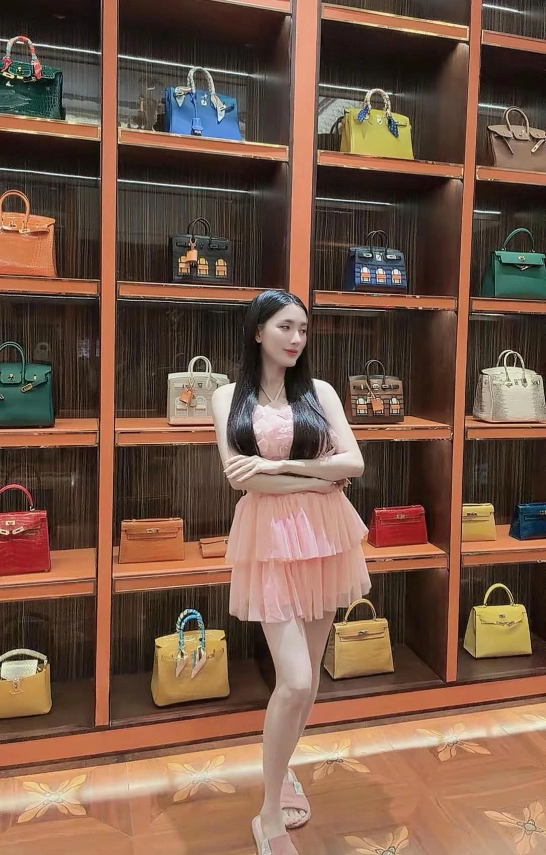 Ngân Collagen chia sẻ hình ảnh check-in cùng phòng đựng túi hiệu.