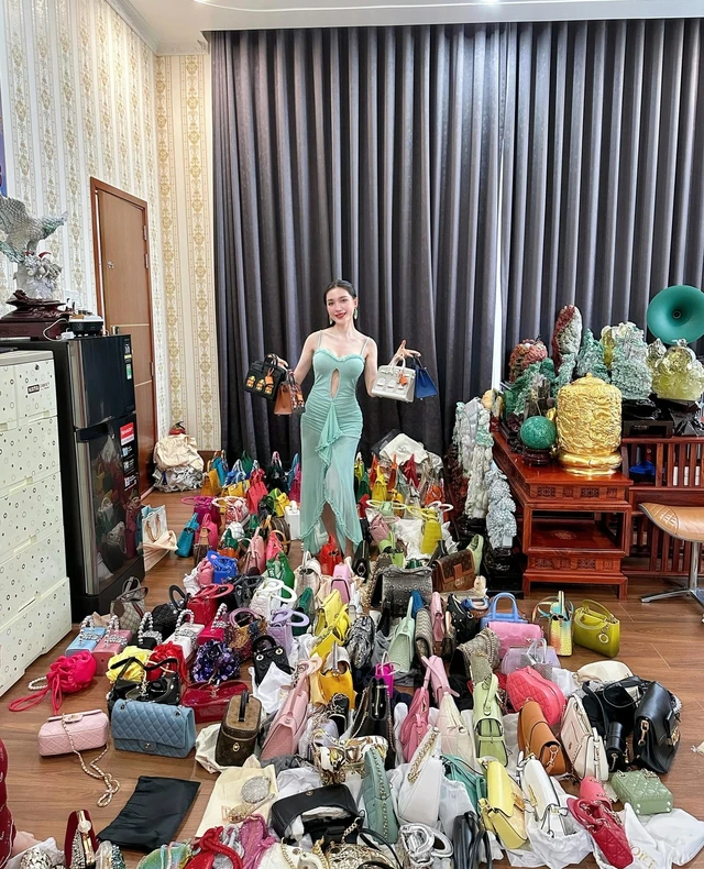 Ngân Collagen từng nhiều lần chia sẻ túi hiệu chất đầy nhà, nằm la liệt trên sàn nhà.