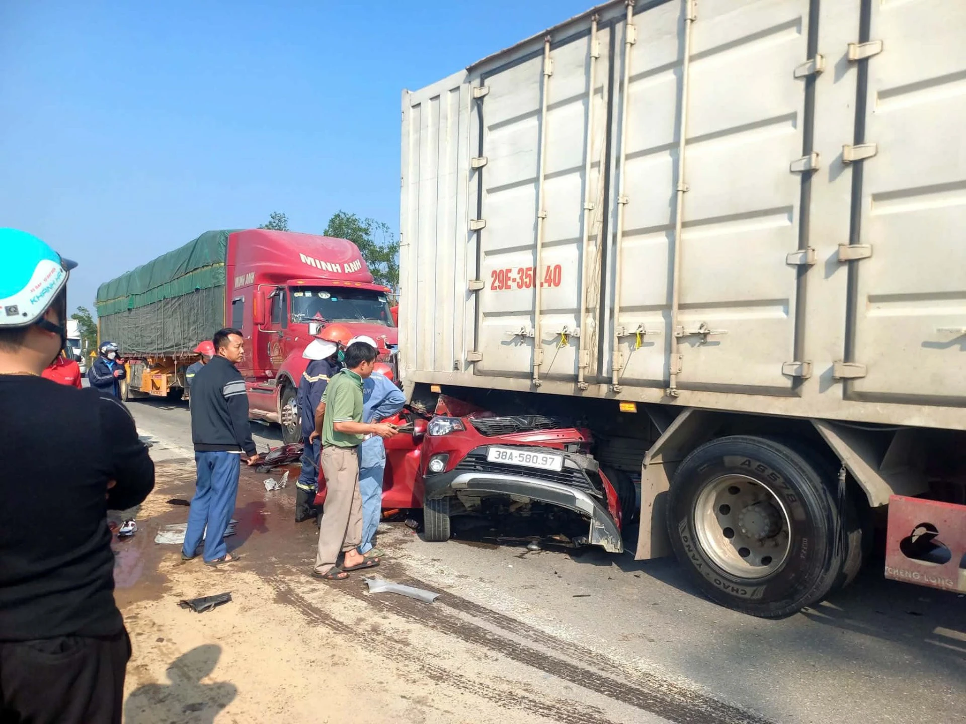 Sau tai nạn liên hoàn, ô tô con bị dồn ép, mắc kẹt dưới gầm xe tải BKS 29E - 350.40. Thời điểm xảy ra tai nạn, trên ô tô con có 3 người.