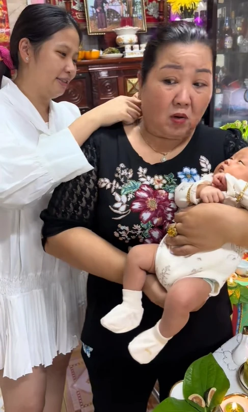 Trong khi mẹ chồng chưa kịp phản ứng, con dâu đã nhanh tay tháo sợi dây chuyền vàng trên cổ bà và đeo cho cháu. Bà nội chỉ còn biết bật cười, vừa bất ngờ vừa chiều con: "Rồi tay đâu mà cự lại, quá trời quá đất rồi, tụi này nó trấn lột luôn".