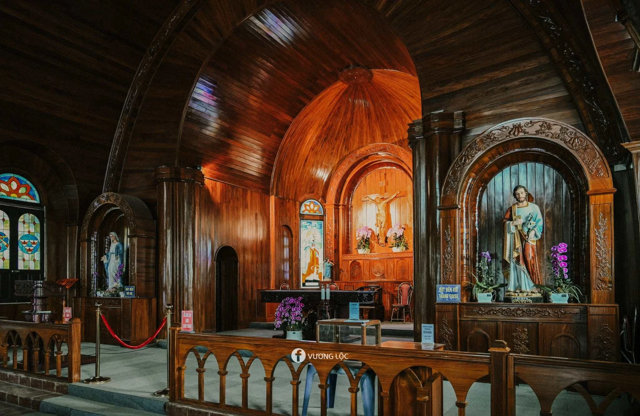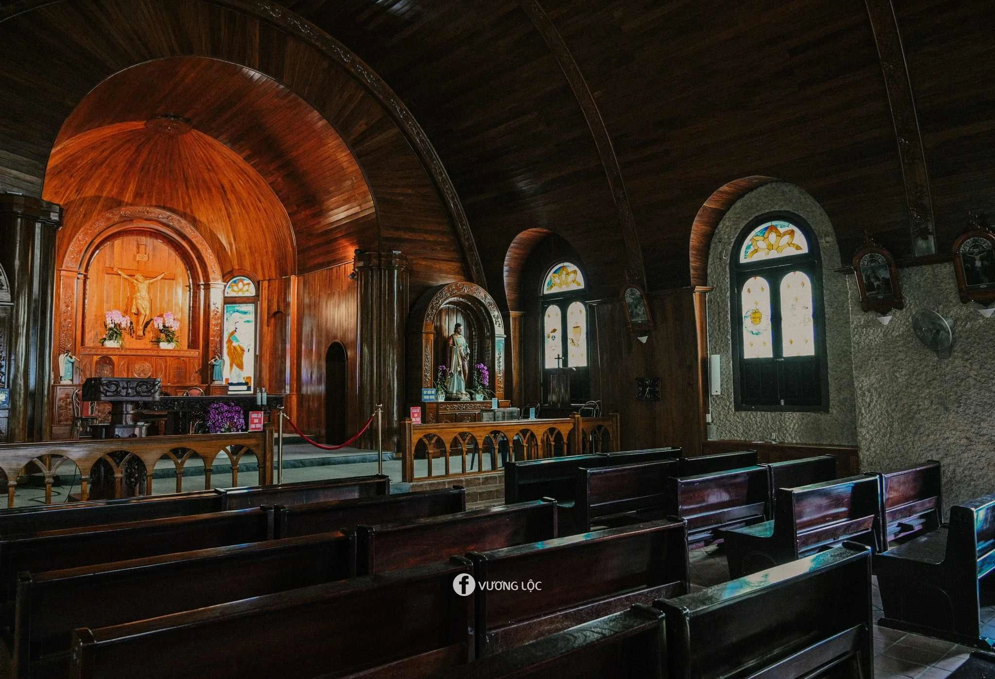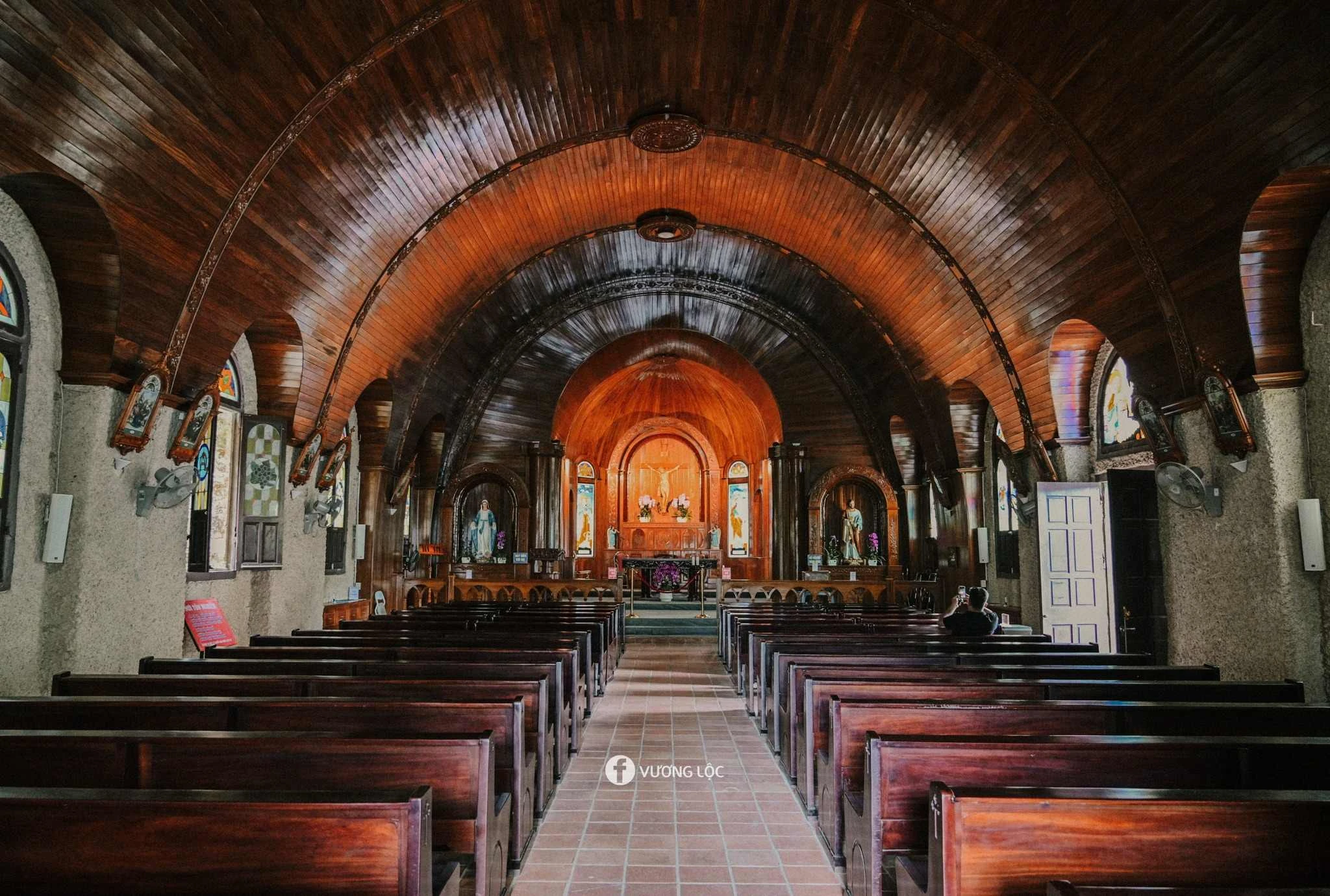 Không gian bên trong nhà thờ được thiết kế đơn giản, không có các hàng cột chính giữa. Ảnh: Vương Lộc