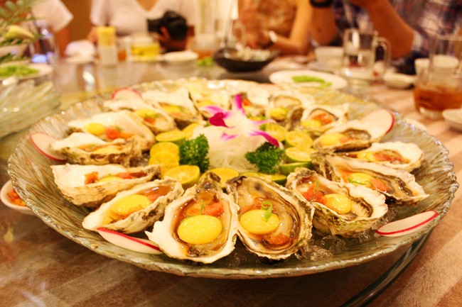 Hàu sống ăn kèm trứng cút sống và các loại gia vị cay. Vì trứng và hàu đều sống nên món ăn này cũng thuộc nhóm món ăn “đáng sợ” của những người ghét thức ăn chưa chín. Ảnh: Tô Huyền.