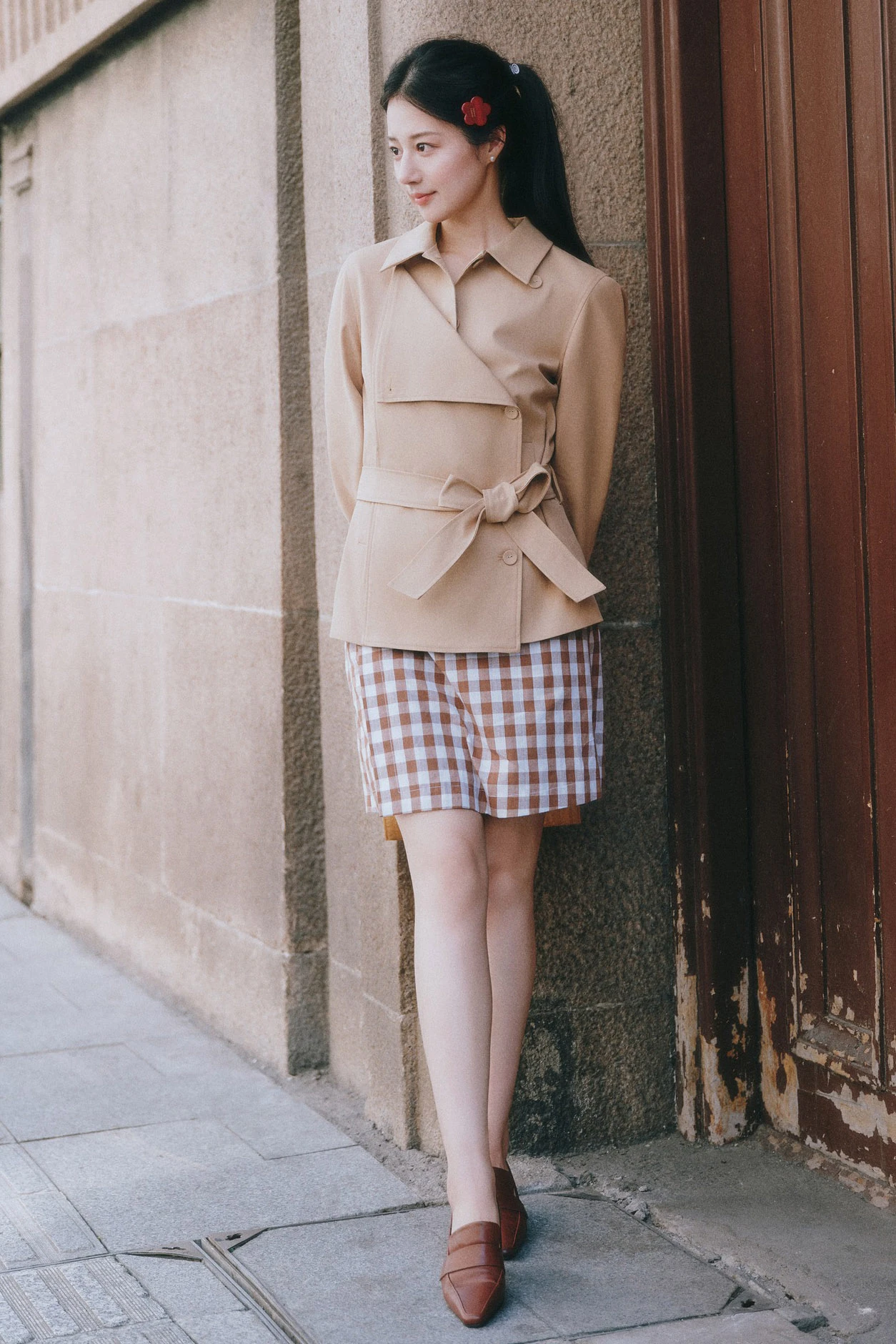 Áo blouse điệu đà với phần viền bèo xếp nếp trước ngực kết hợp chân váy phá cách hay thiết kế váy gingham trắng và nâu phối áo trench coat màu be là những ý tưởng tuyệt vời để nàng xuống phố đầy phong cách trong dịp đầu đông 2025