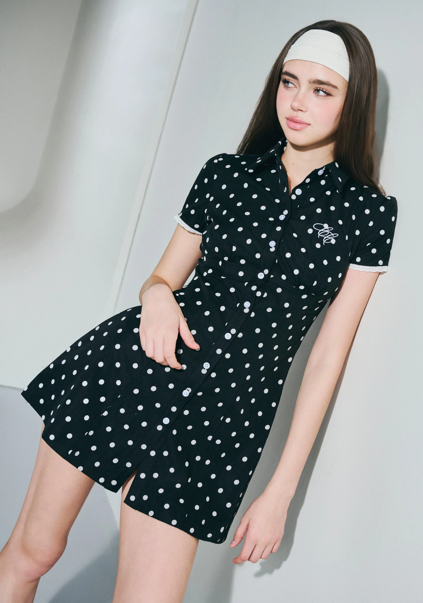 Váy sơ mi chấm bi dáng chữ A vừa năng động, khỏe khoắn lại hiện đại và trẻ trung. Tông màu nền tối giúp giấu nhược điểm cơ thể trong khi các họa tiết chấm tròn giúp tạo nên sự tươi sáng và thu hút