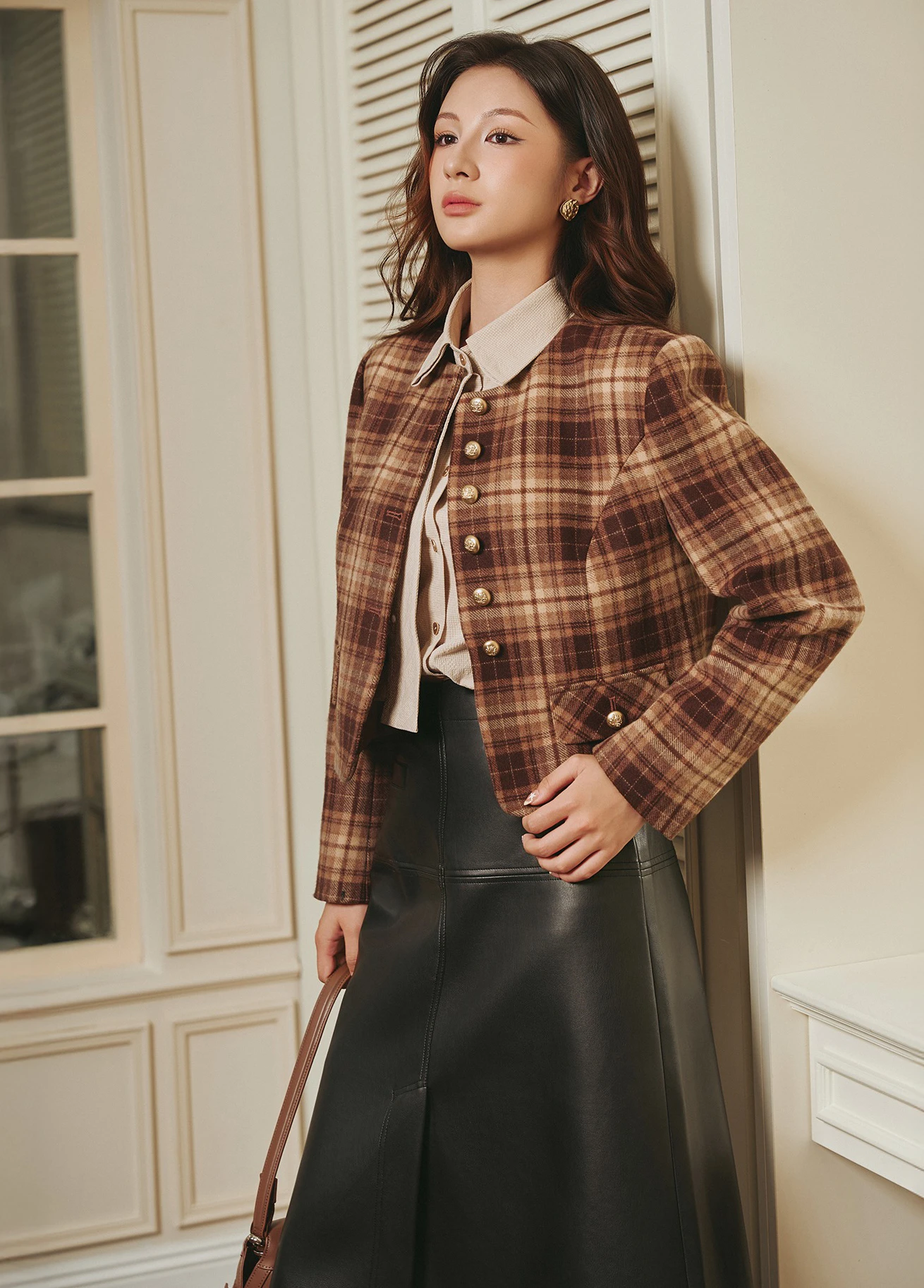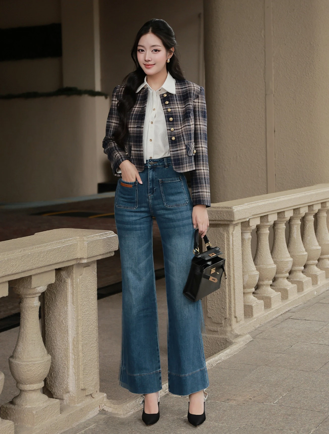 Một bản phối trang nhã và thanh lịch với quần jeans xanh , sơ mi trắng và giày cao gót được tạo điểm nhấn bằng áo khoác crop vải dạ họa tiết kẻ ô vuông cổ điển