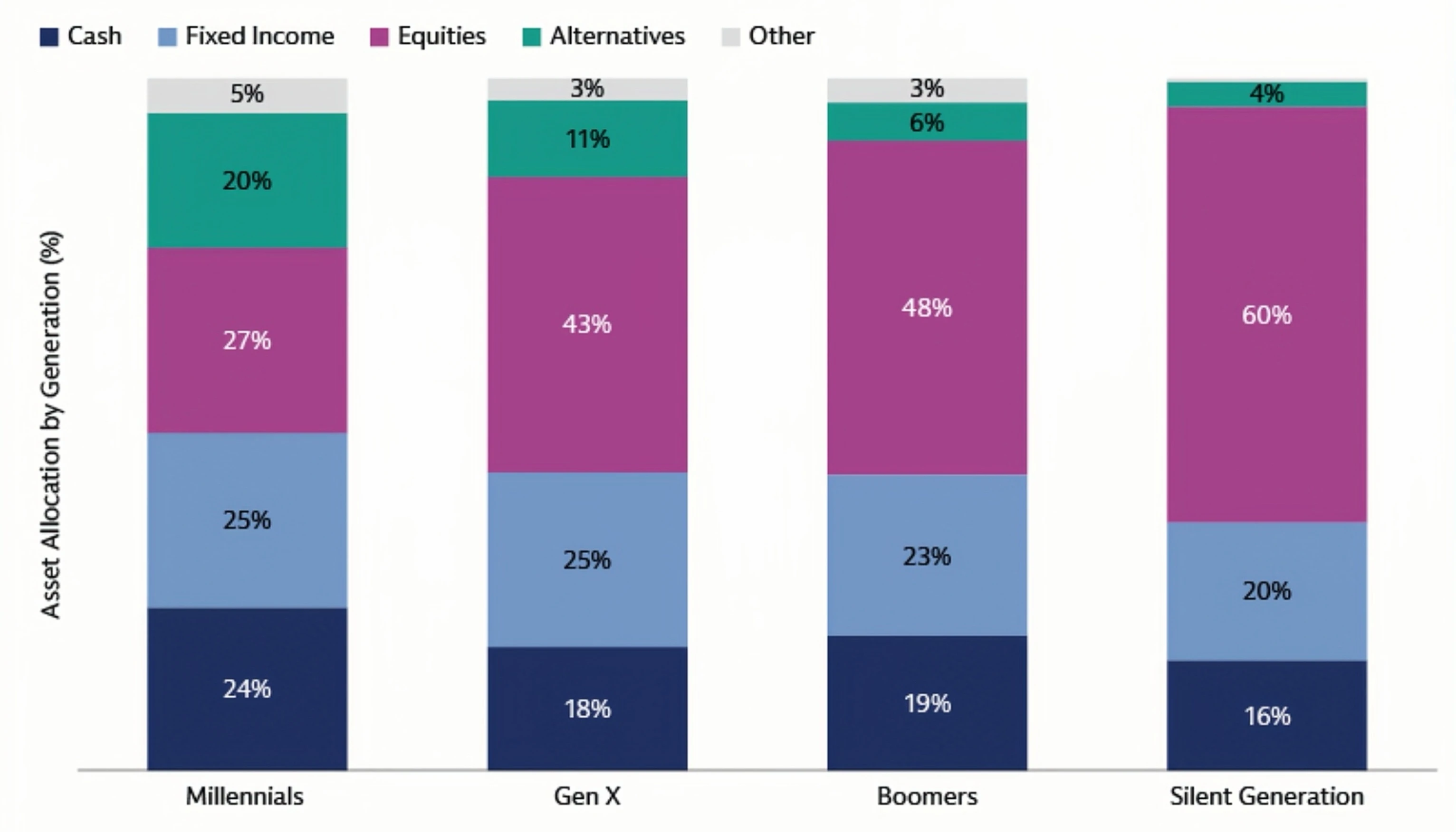 Trong khảo sát 1.000 nhà đầu tư có tài sản ròng cao (High Net Worth Individuals), Goldman Sachs ghi nhận Millennials đang dẫn đầu xu hướng này, với mức độ hiểu biết và tỷ lệ phân bổ vào tài sản thay thế cao hơn đáng kể so với các thế hệ trước. Báo cáo cho rằng đây là sự thay đổi trong tư duy đầu tư, thế hệ trẻ không còn chỉ tìm kiếm lợi nhuận ngắn hạn, mà hướng đến lợi nhuận cao hơn trên cơ sở kiểm soát rủi ro và đa dạng hóa danh mục.
