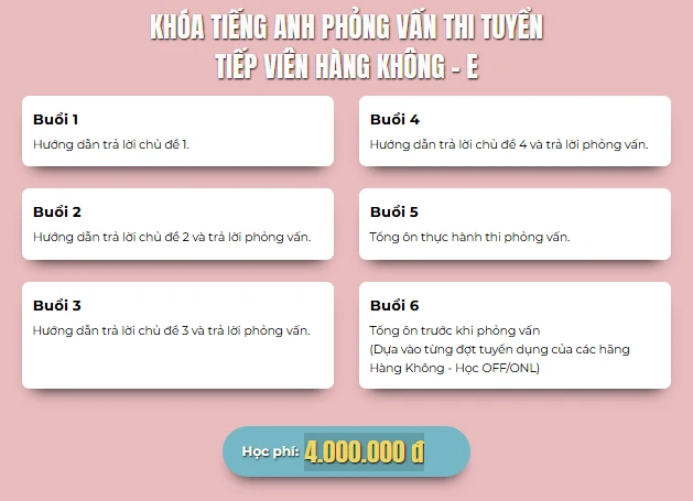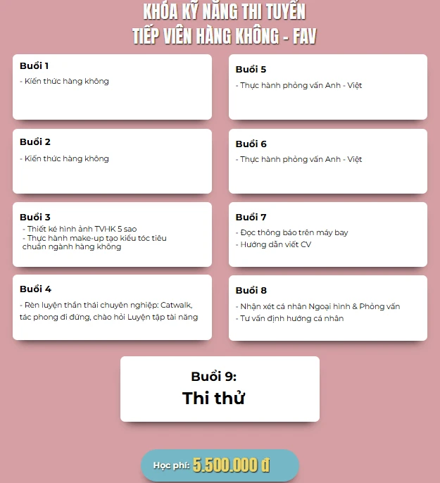 Hầu hết trong các phần giới thiệu khóa học của các học viện, lớp đào tạo đều ghi rõ về mức chi phí cũng như các nội dung giảng dạy. Bên cạnh đó, các khóa học cũng được chia nhỏ từ 9 – 12 buổi, đào tạo 2 phần kỹ năng riêng như kỹ năng thi tuyển tiếp viên hàng không và kỹ năng trả lời phỏng vấn thi tuyển bằng tiếng Anh.