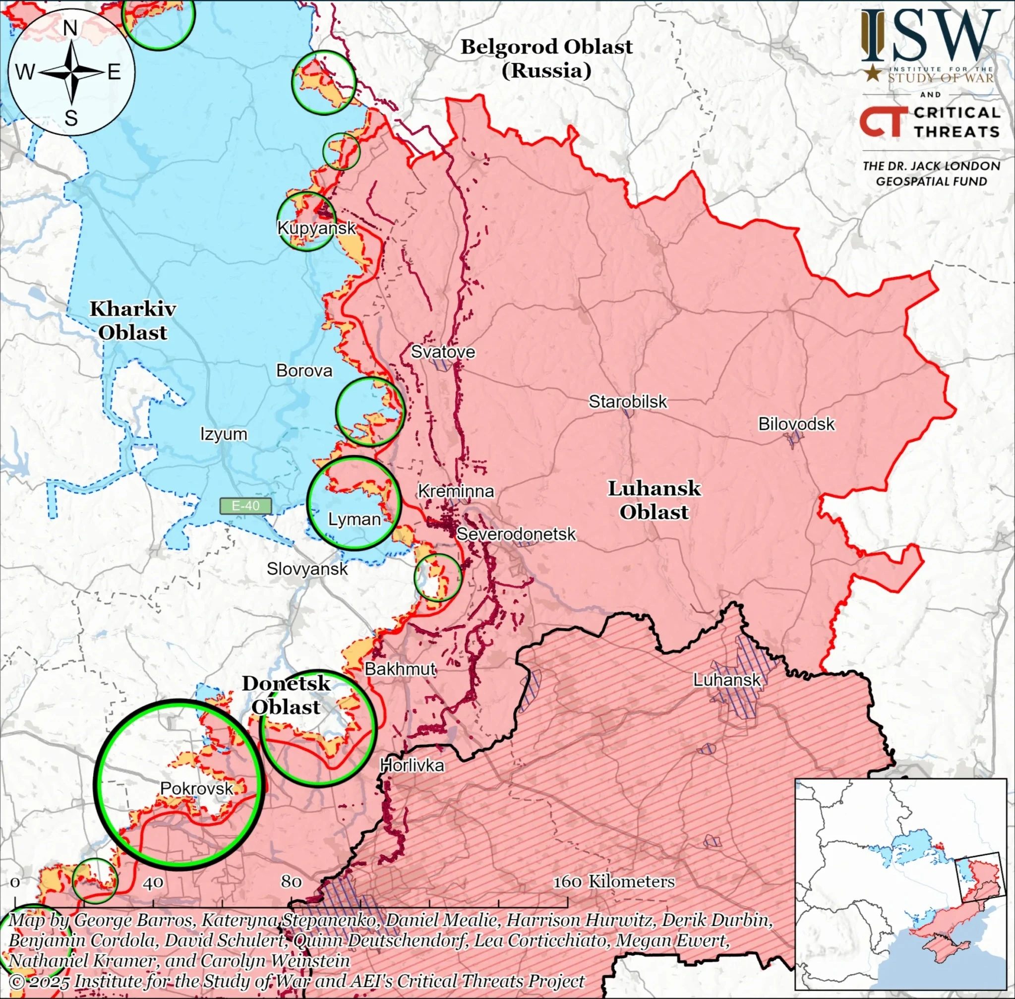 Các điểm nóng ở mặt trận phía Đông Ukraine (Ảnh: ISW).