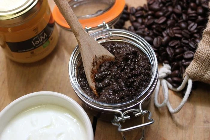 Trộn bã cà phê với dầu dừa hoặc dầu ô liu/mật ong/sữa chua không đường.