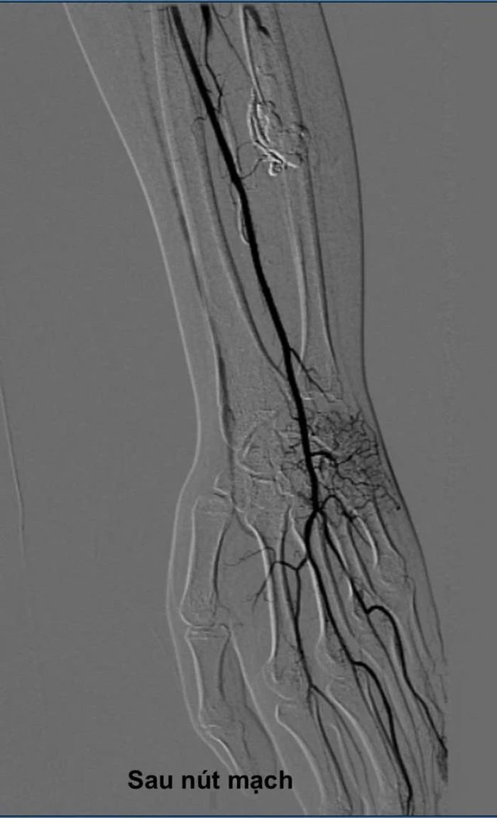 Ngay sau can thiệp, ổ dị dạng đã được bịt kín, dòng máu được tái lập bình thường. Chỉ sau vài ngày, các triệu chứng đau tê ngón tay của bệnh nhân Q. đã giảm rõ rệt.