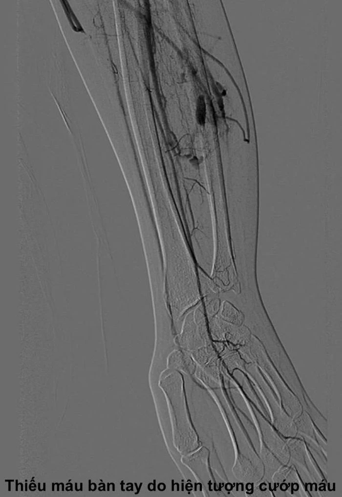 TS. Cương giải thích, dòng máu tốc độ cao đi tắt qua ổ dị dạng này sẽ không kịp cung cấp oxy và dưỡng chất cho vùng mô ở phía hạ lưu. Điều này dẫn đến hiện tượng “ăn cắp máu” (steal phenomenon), tức là ổ dị dạng hút máu từ các mạch máu bình thường lân cận, khiến các ngón tay hoặc chi bị thiếu máu nuôi mạn tính. Đây chính là nguyên nhân gây ra các triệu chứng đau, tê, sưng, nóng , hoặc thậm chí biến dạng chi của bệnh nhân Q.