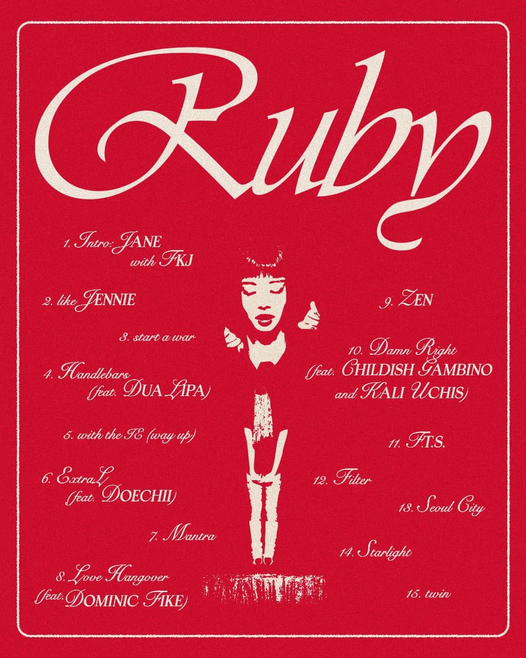 Màn kết hợp với Doechii sẽ lên sóng vào ngày 21/2. Mới đây, Jennie công bố thông tin tracklist album RUBY gồm 15 ca khúc, gây tò mò bởi những cái tên đậm cá tính riêng của cô nàng. Concept thú vị, Jennie biến hoá như “tắc kè hoa” với đủ thử nghiệm âm nhạc khiến khán giả hào hứng. Album đầu tay của Jennie sẽ ra mắt vào ngày 7/3, đụng độ trực tiếp với màn tái xuất của “Mẹ Quái Vật” Lady Gaga.