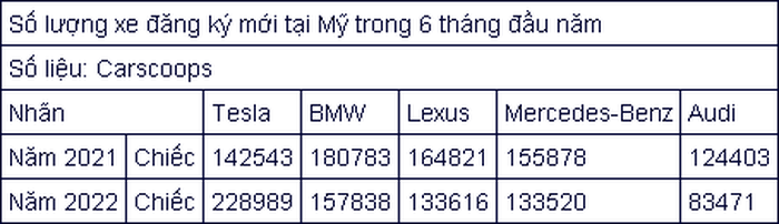 Điều này đưa Tesla vượt xa các thương hiệu xe sang, điển hình là BMW. Hãng xe Đức chỉ đạt 157.838 chiếc trong 6 tháng đầu năm, giảm 13% so với cùng kỳ năm 2021.