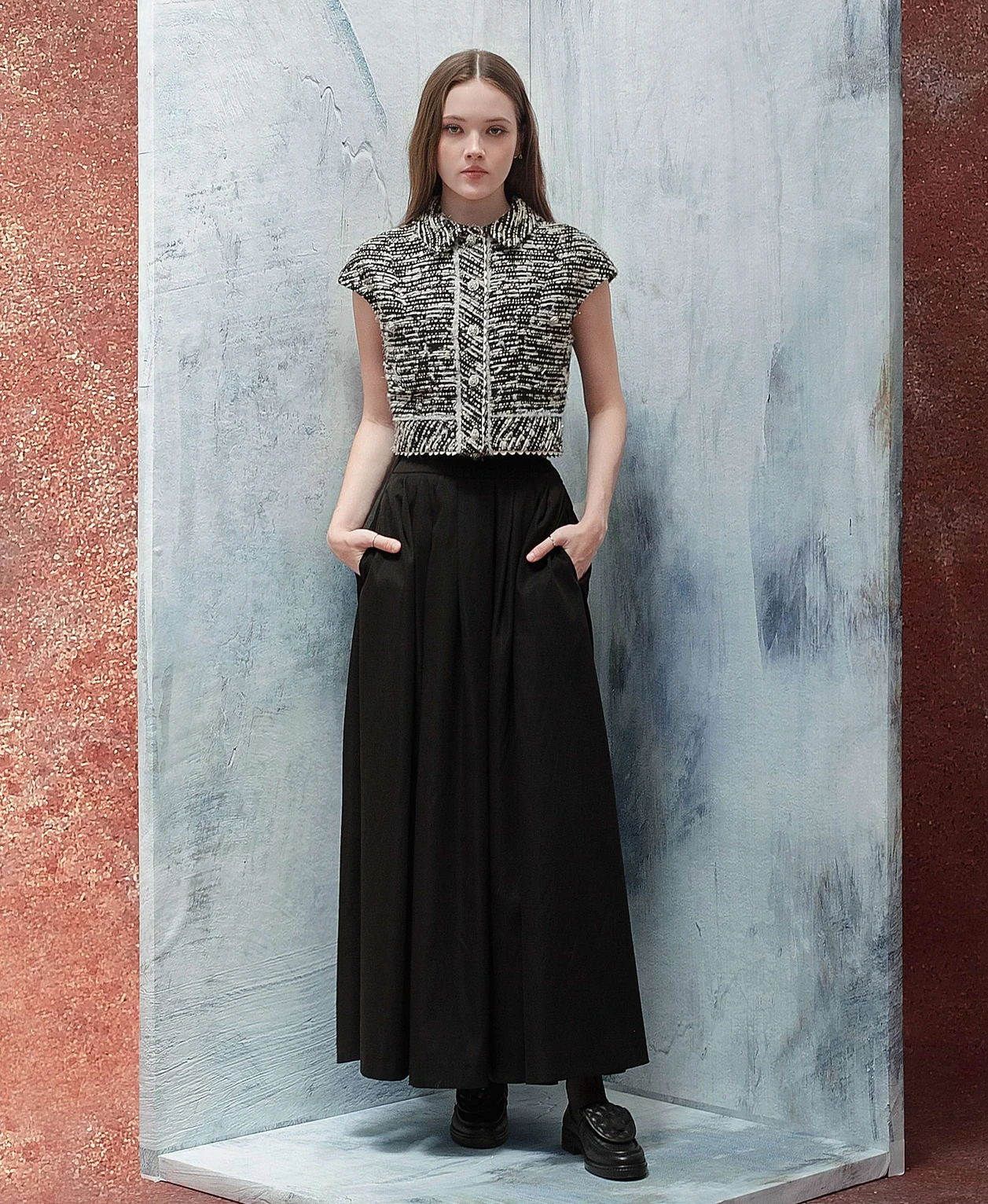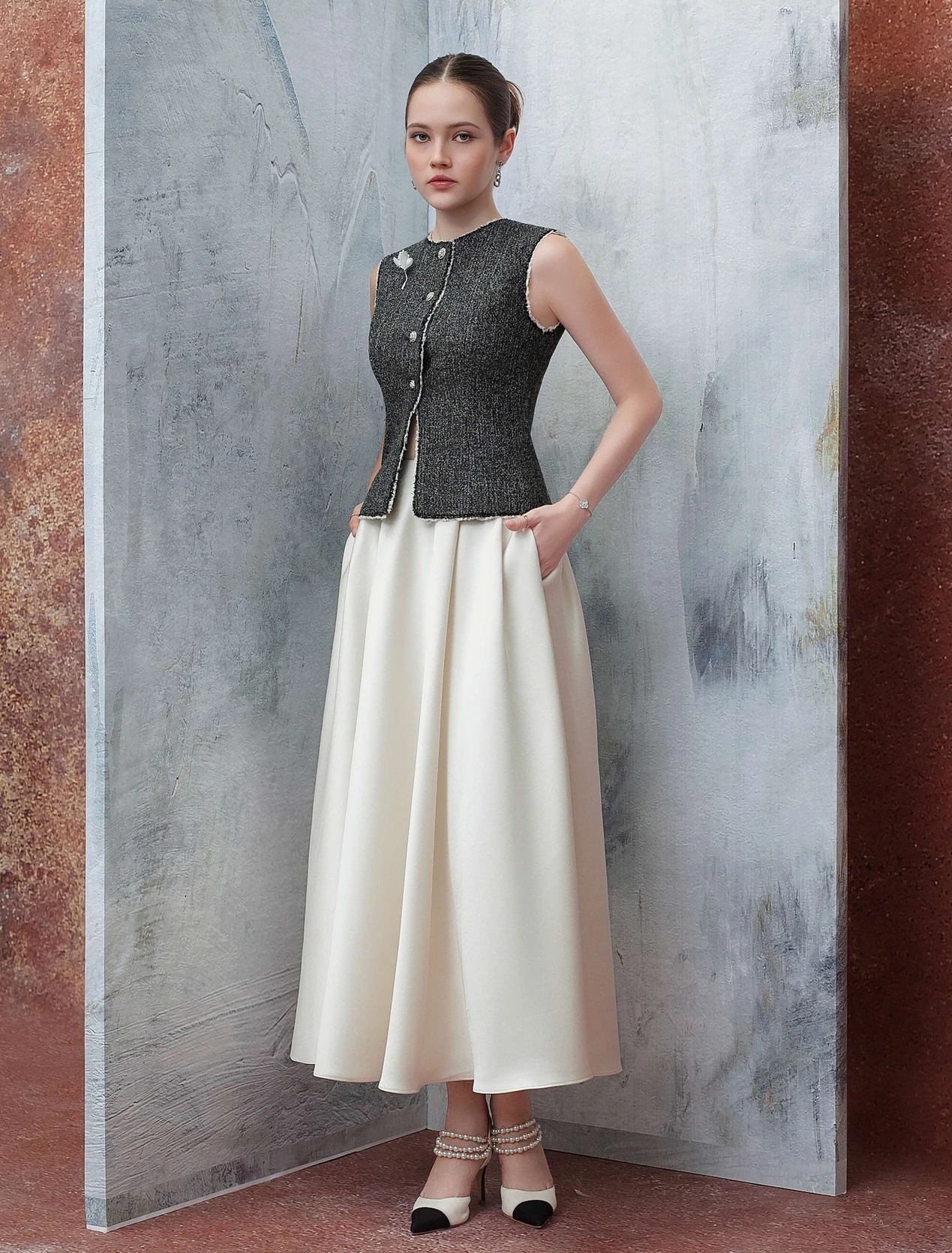 Chân váy dài hoặc váy liền dáng dài có thể linh hoạt phối cùng blazer, jacket, áo khoác cardigan, áo vest hay các thiết kế may đo tailor đứng phom có dáng ngắn/dáng lửng (cropped). Ngoài tỷ lệ về độ dài, hãy chú trọng vào sự tương phản hoặc đồng điệu chất liệu trên bản phối, tông màu và chi tiết trang trí. Những yếu tố này góp phần không nhỏ trong việc tạo nên các bản phối thời thượng, sang trọng thu hút mọi ánh nhìn.