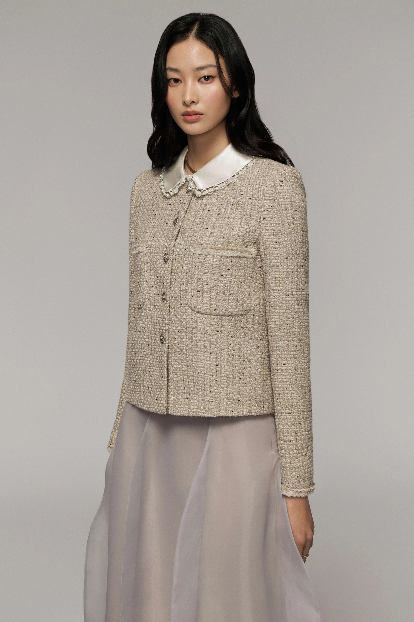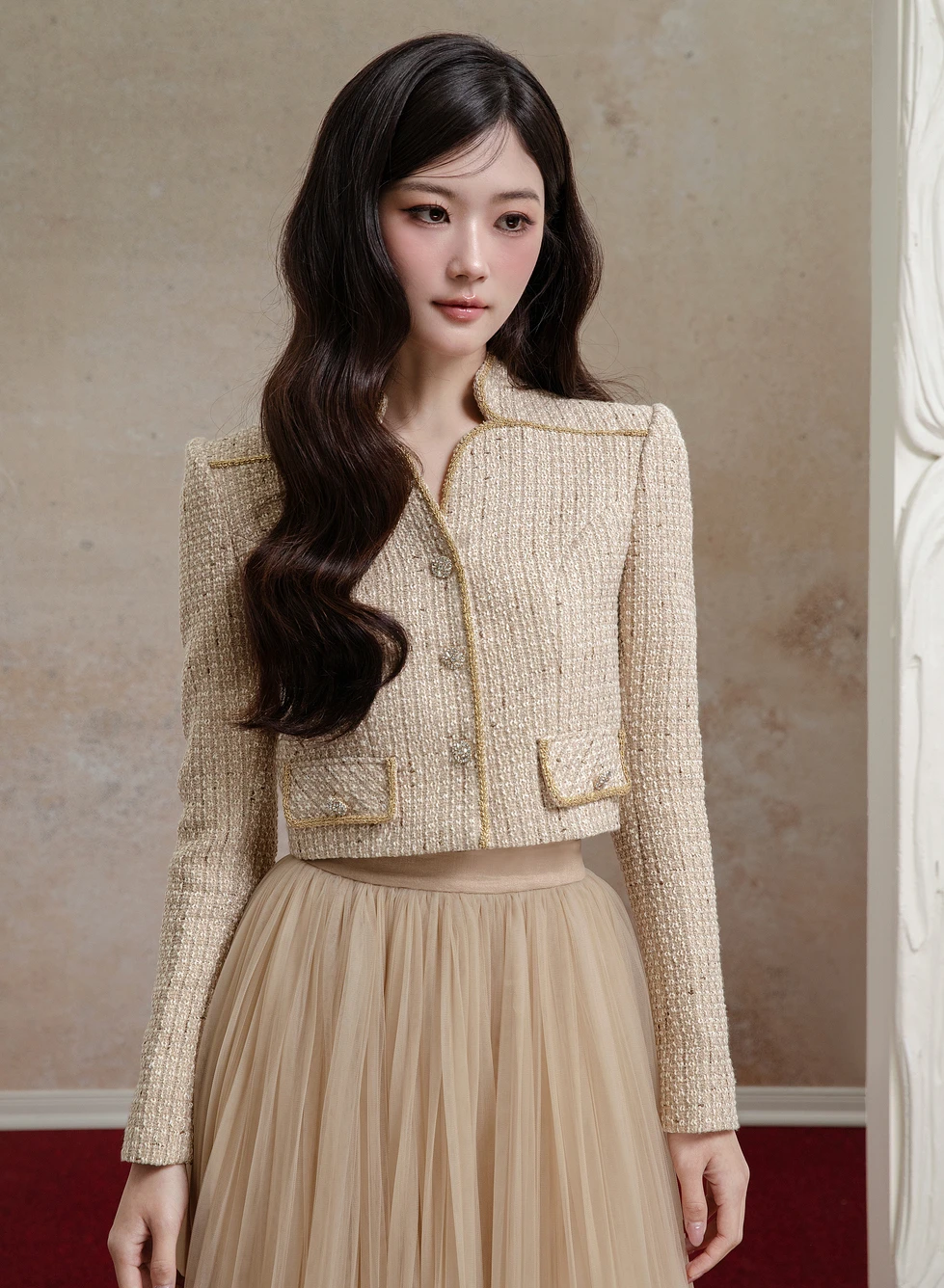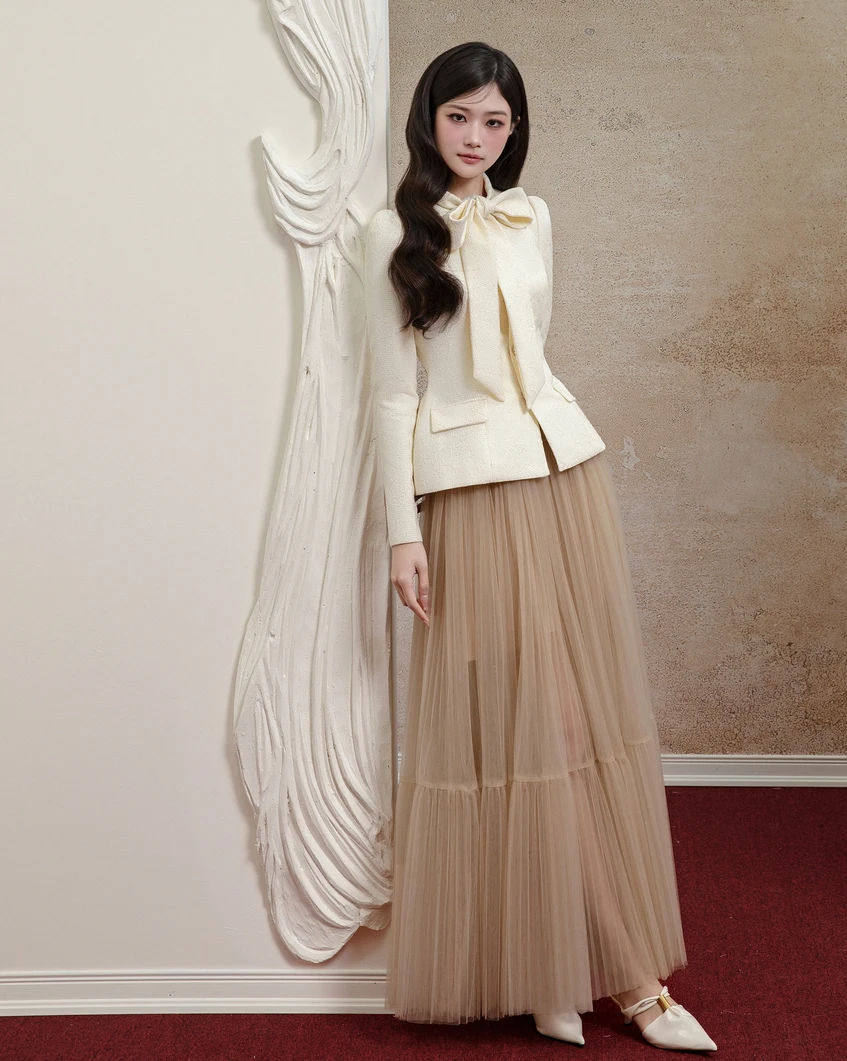 Áo tweed dáng ngắn phối chân váy tulle bồng bềnh gây hiệu ứng thị giác bởi nét đẹp sang chảnh và quý phái. Tuy chất liệu có sự tương phản giữa thô dày và mỏng nhẹ, đứng phom và bay bổng nhưng gam màu be chủ đạo đã khéo tạo nên hình ảnh hoàn hảo cho quý cô
