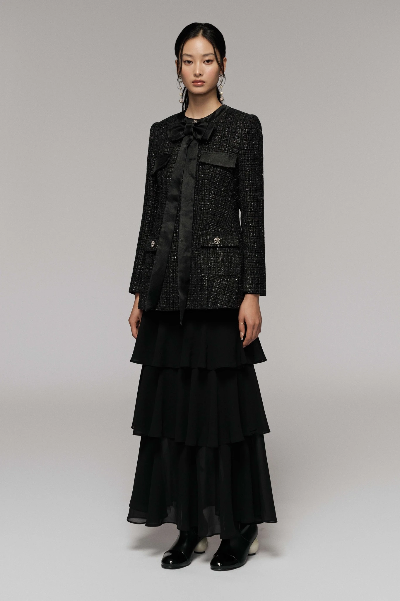 Bản phối váy dài và áo khoác dáng ngắn là một lựa chọn mới cho những buổi đi chúc tết đầu năm 2026, sau khi nàng đã 'chán' diện các thiết kế truyền thống và cách tân khác.