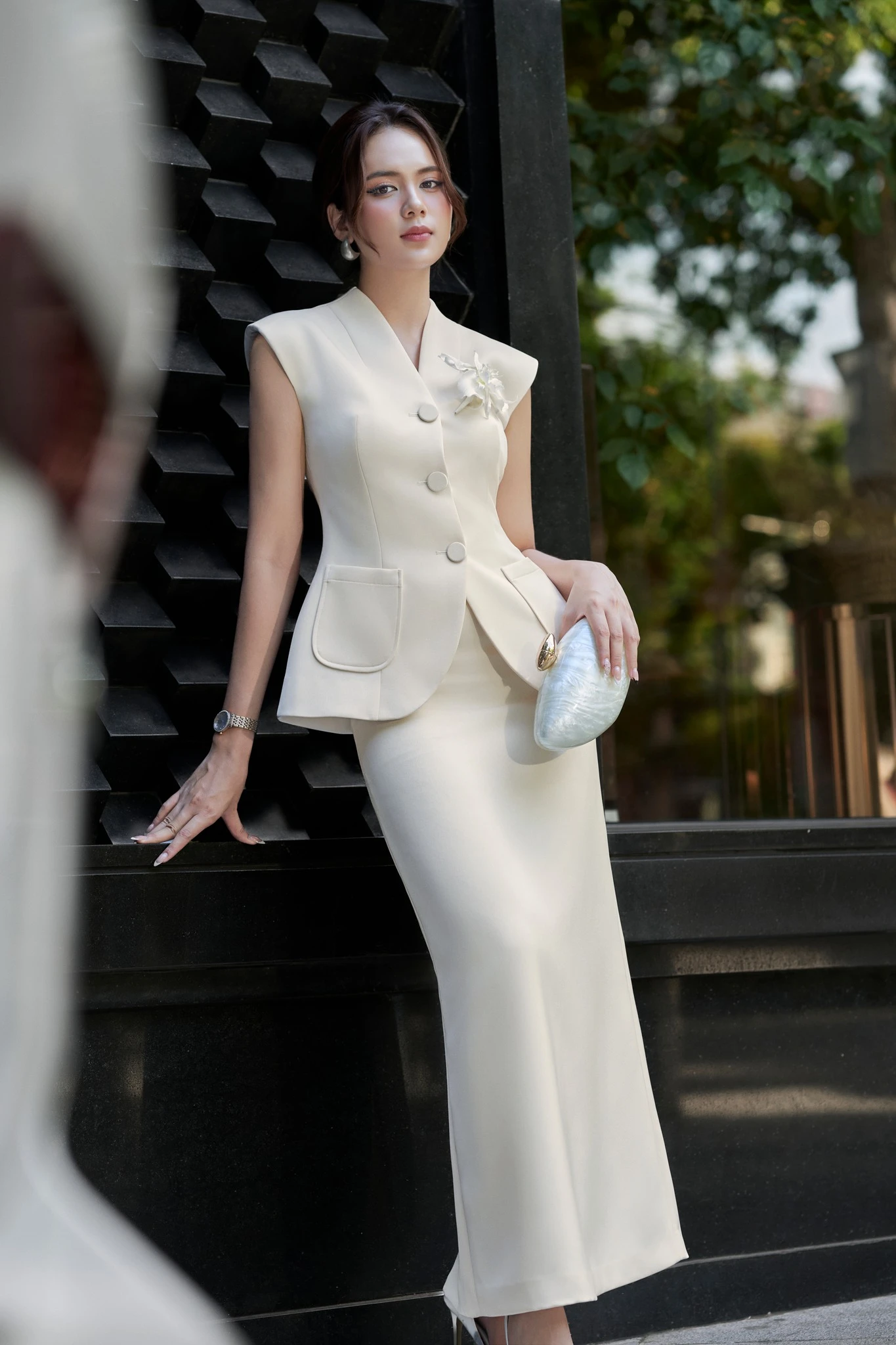Áo vest cách điệu có chi tiết thắt nơ bản lớn tạo nên điểm nhấn cho bản phối mặc cùng chân váy xếp tầng. Dù tủ đồ có bao nhiêu tông màu thì cặp đôi kem và be vẫn là chuẩn mực cho vẻ đẹp thanh lịch cổ điển