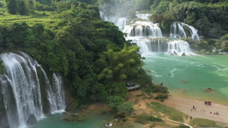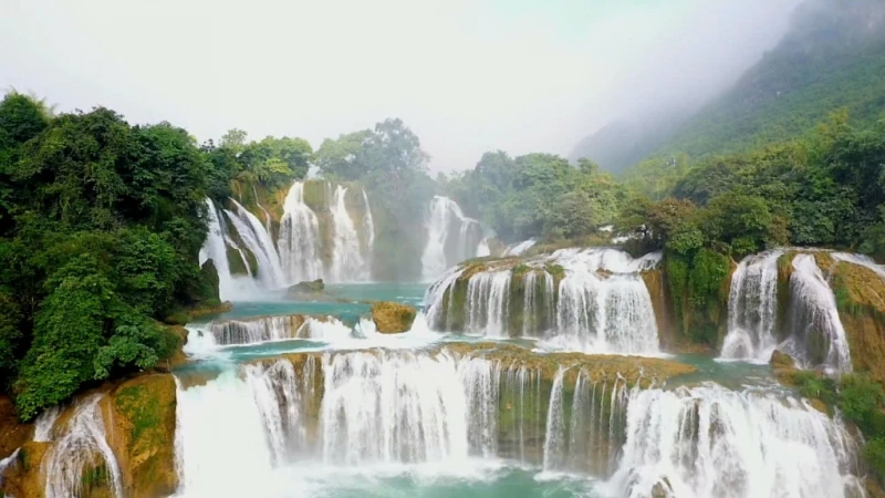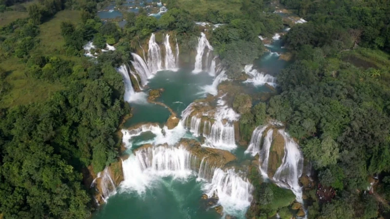 Nhìn từ trên cao, thác Bản Giốc hiện lên kỳ vĩ với nhiều tầng nước đổ, nơi nước, mây và núi rừng hòa quyện thành khúc tráng ca của thiên nhiên miền biên viễn.