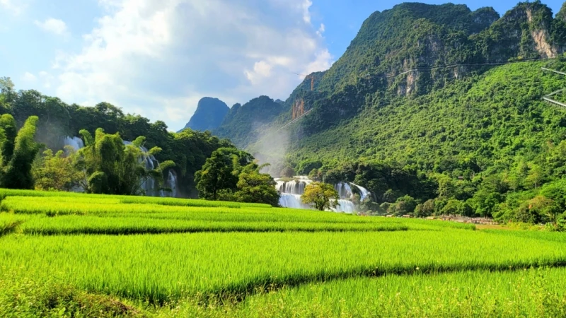 Từ thửa ruộng vàng ươm mùa gặt, thác Bản Giốc hiện lên phía xa như dải lụa bạc giữa đại ngàn, gợi khung cảnh thanh bình đến say lòng.