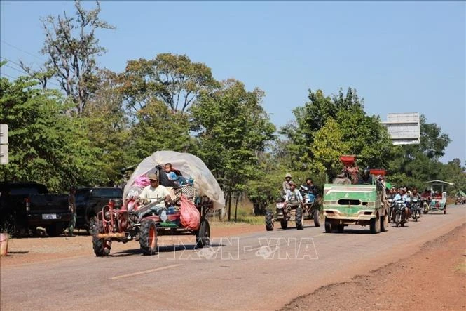 Người dân Campuchia ở tỉnh Preah Vihear , giáp giới với Thái Lan sơ tán tránh xung đột , ngày 8/12/2025. Ảnh: THX/TTXVN
