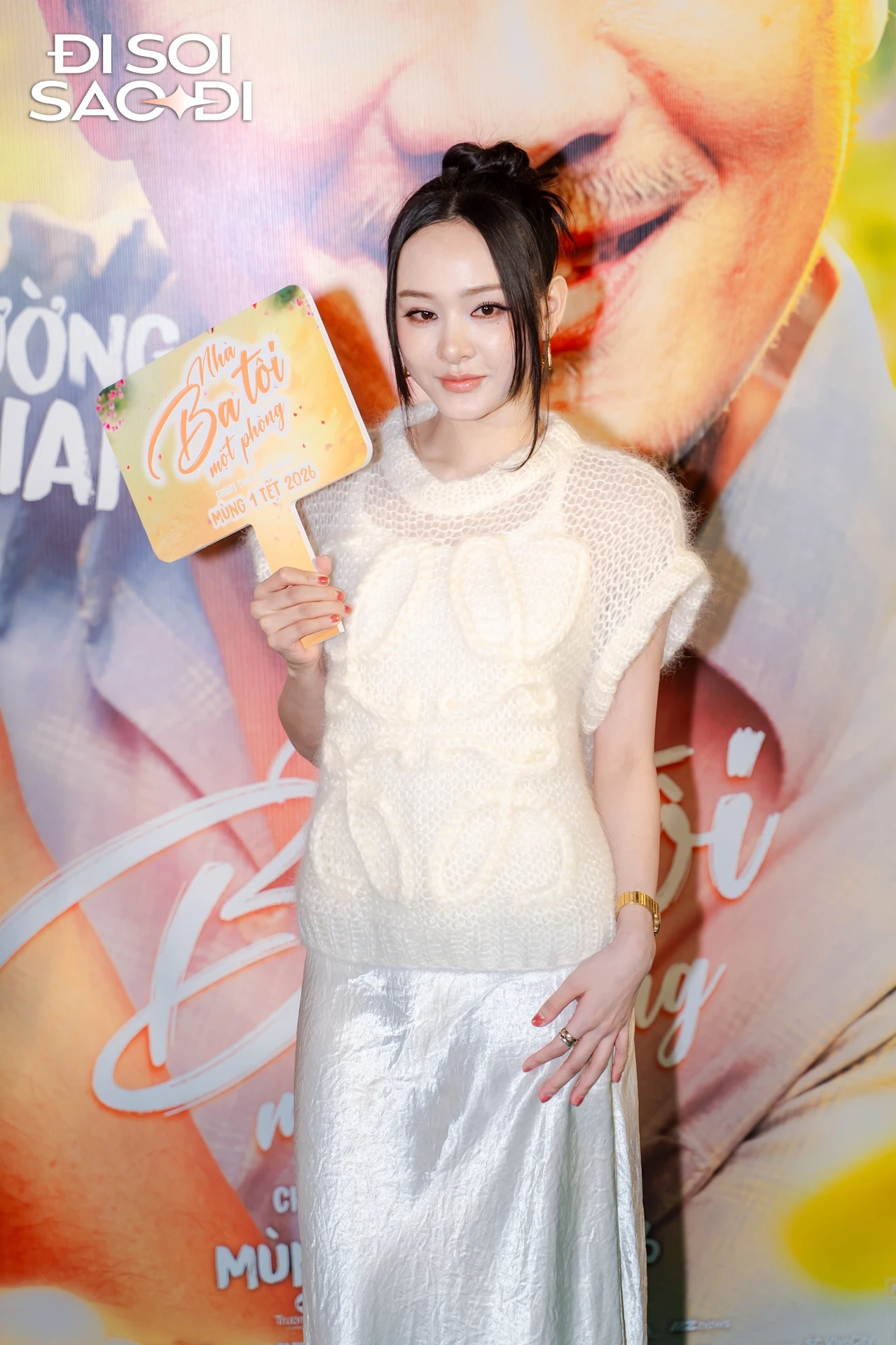 Hiền Hồ cũng là một nhân tố hút ống kính khi đây là lần hiếm hoi xuất hiện trên thảm đỏ lớn. Nữ ca sĩ lựa chọn trang phục trắng, biến tấu với váy lựa và áo đan len trendy. Hiền Hồ để tóc búi cùng layout makeup trung tính lạ lẫm, vô tình khiến giao diện trở nên nhợt nhạt, thiếu sức sống.