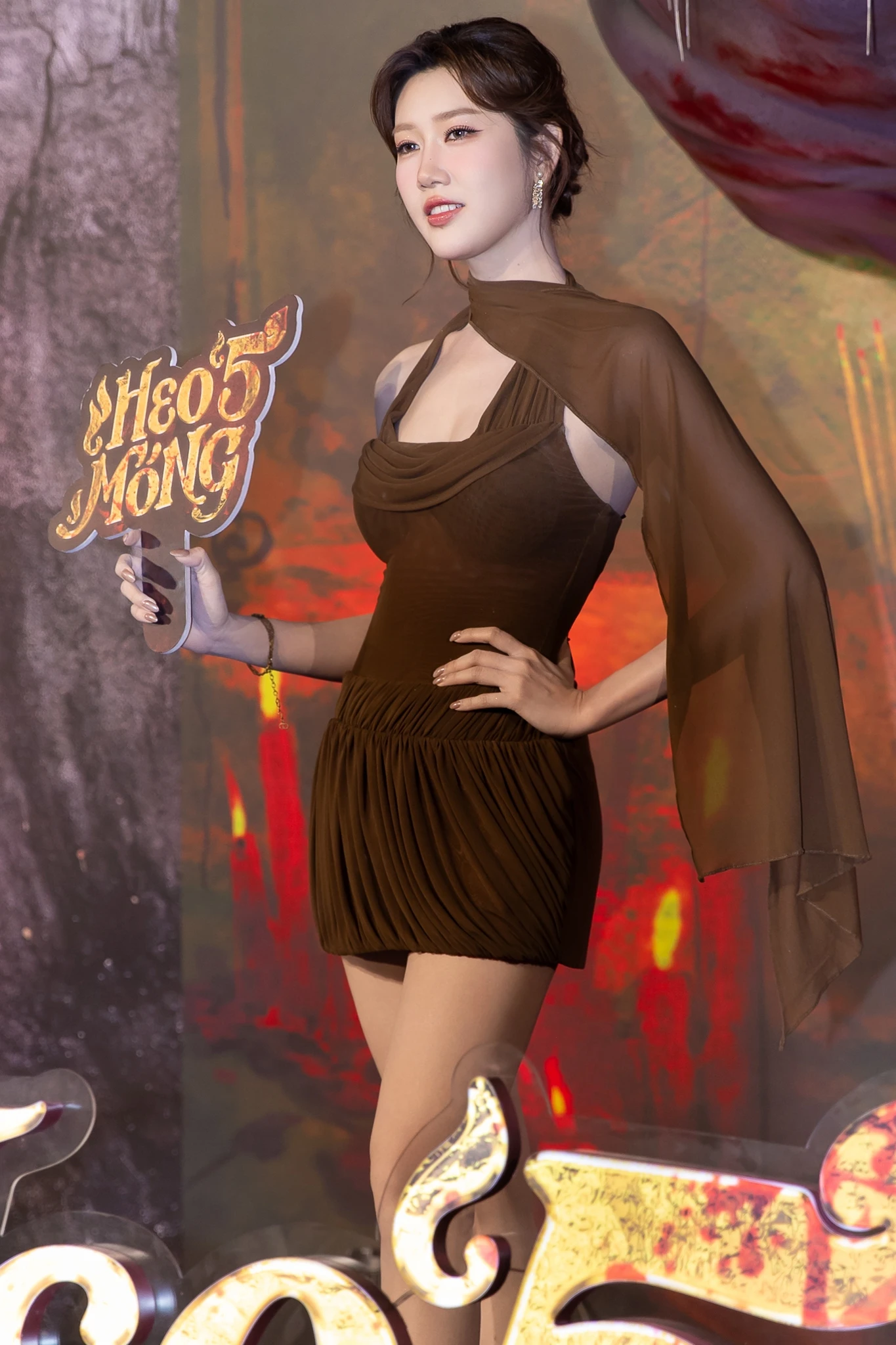 Trong khi đó, Thúy Ngân vừa xuất hiện đã khiến đám đông trầm trồ. Nữ diễn viên chọn một thiết kế váy ngắn tông màu nâu đất vô cùng tôn da, với những đường cắt xẻ tinh tế ở phần vai và cổ, khoe khéo bờ vai trần quyến rũ. Đặc biệt, đôi chân dài của người đẹp Tiền Giang được phô diễn triệt để, thu hút mọi ánh nhìn. Layout trang điểm nhẹ nhàng, trong trẻo kết hợp cùng kiểu tóc búi cao giúp Thúy Ngân toát lên vẻ sang trọng, quý phái nhưng vẫn không kém phần trẻ trung.