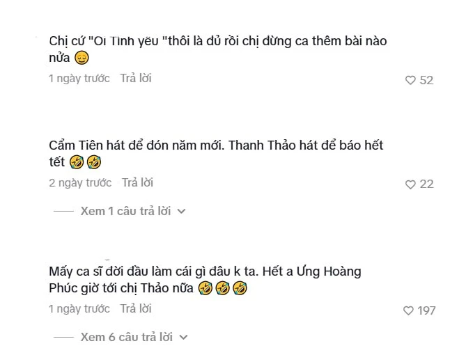 Không khả quan hơn người đồng nghiệp, Thanh Thảo cũng nhận về nhiều ý kiến trái chiều khi trình làng bản cover ca khúc Kìa Tết Đang Sang . Vẫn giữ năng lượng biểu diễn sôi động đặc trưng, nhưng sự nhiệt huyết này dường như không cứu vãn nổi một tư duy âm nhạc đã “lệch pha” so với thị hiếu 2026. Ca khúc bị nhận xét là cũ kỹ từ giai điệu, ca từ cho đến bản phối khí. Nhiều netizen soi ra MV có concept cũ kỹ, hiệu ứng hình ảnh lạc hậu, tạo cảm giác như một sản phẩm tồn kho từ nhiều năm trước nay mới được phát hành. Sự sến súa trong cách nhả chữ cộng với beat nhạc đơn điệu khiến Kìa Tết Đang Sang trở nên xa lạ và khó ngấm đối với lứa khán giả trẻ.