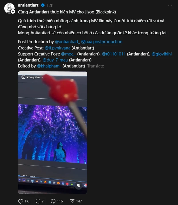 Đính kèm bài đăng là video ngắn mô tả lại công đoạn hậu kỳ cho phân cảnh ảo diệu trong hang động của Jisoo. Antiantiart đã "phù phép" cho những thước phim mộc mạc trở nên huyền ảo, lấp lánh, đáp ứng concept tiên nữ khu rừng của Jisoo. Vẫn là đạo diễn Phương Vũ và những cộng sự thân thiết, Antiantiart đã mang đến thành phẩm đáp ứng tiêu chuẩn khắt khe của ngôi sao quốc tế như Jisoo.